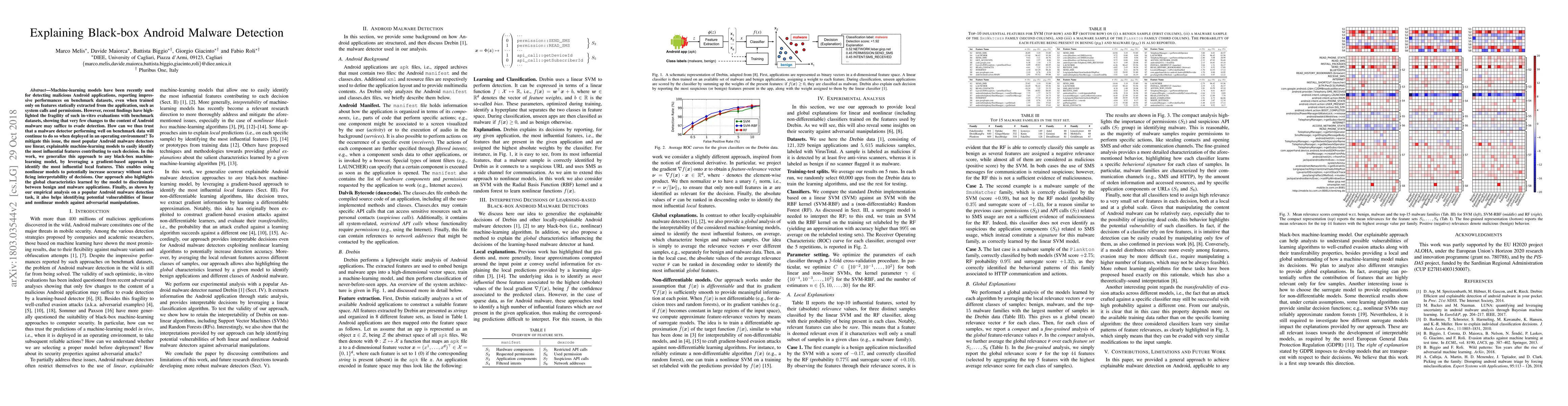 Machine-learning models have been recently used for detecting malicious Android applications, reporting impressive performances on benchmark datasets, even when trained only on features statically extracted from the application, such as system calls and permissions. However, recent findings have highlighted the fragility of such in-vitro evaluations with benchmark datasets, showing that very few changes to the content of Android malware may suffice to evade detection. How can we thus trust that a malware detector performing well on benchmark data will continue to do so when deployed in an operating environment? To mitigate this issue, the most popular Android malware detectors use linear, explainable machine-learning models to easily identify the most influential features contributing to each decision. In this work, we generalize this approach to any black-box machine- learning model, by leveraging a gradient-based approach to identify the most influential local features. This enables using nonlinear models to potentially increase accuracy without sacrificing interpretability of decisions. Our approach also highlights the global characteristics learned by the model to discriminate between benign and malware applications. Finally, as shown by our empirical analysis on a popular Android malware detection task, it also helps identifying potential vulnerabilities of linear and nonlinear models against adversarial manipulations.