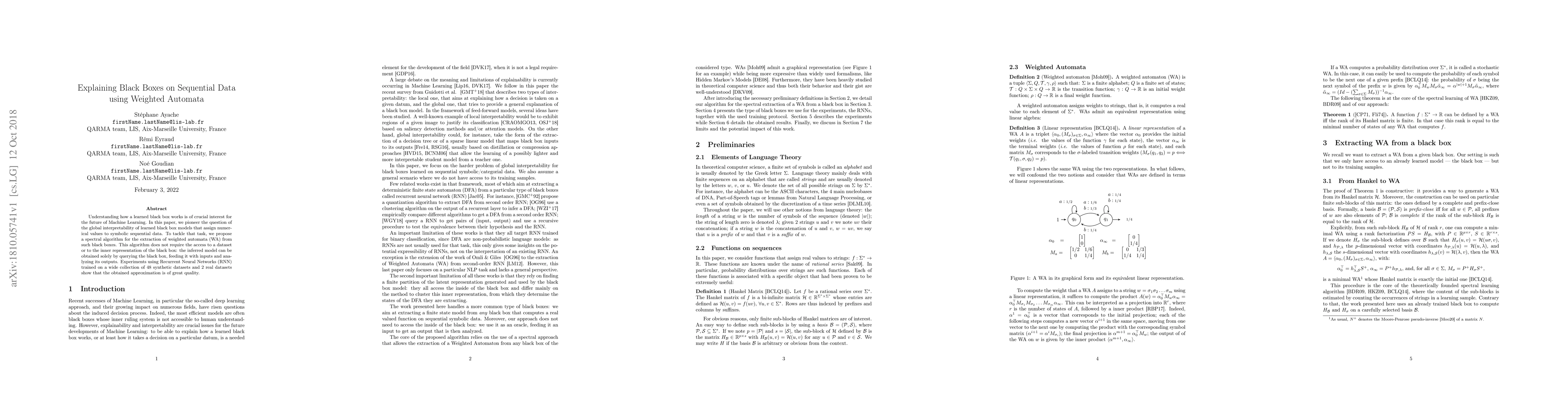 Understanding how a learned black box works is of crucial interest for the future of Machine Learning. In this paper, we pioneer the question of the global interpretability of learned black box models that assign numerical values to symbolic sequential data. To tackle that task, we propose a spectral algorithm for the extraction of weighted automata (WA) from such black boxes. This algorithm does not require the access to a dataset or to the inner representation of the black box: the inferred model can be obtained solely by querying the black box, feeding it with inputs and analyzing its outputs. Experiments using Recurrent Neural Networks (RNN) trained on a wide collection of 48 synthetic datasets and 2 real datasets show that the obtained approximation is of great quality.