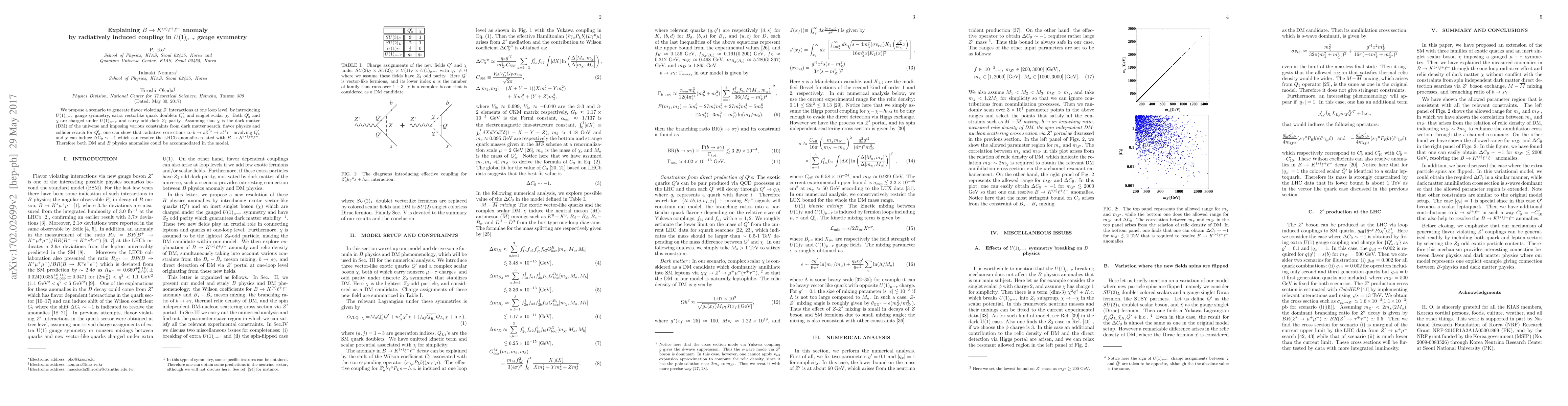We propose an extension of the standard model (SM) with $U(1)_{\mu-\tau}$ gauge symmetry, extra vectorlike quark doublets $Q'_a$ and singlet scalar $\chi$, both of which are charged under $U(1)_{\mu-\tau}$ and carry {odd} dark $Z_2$ parity. Then assuming that $\chi$ is the dark matter (DM) of the universe and imposing various constraints from dark matter search, flavor physics and collider search for $Q'_a$, one can show that radiative corrections to $b\rightarrow s Z^{'*} \rightarrow s l^+ l^- $ involving $Q'_a$ and $\chi$ can induce $\Delta C_9 \sim -1$ which can resolve the LHCb anomalies related with $B\to K^{(*)} \ell^+ \ell^-$. Therefore both DM and $B$ physics anomalies could be accommodated in the model.