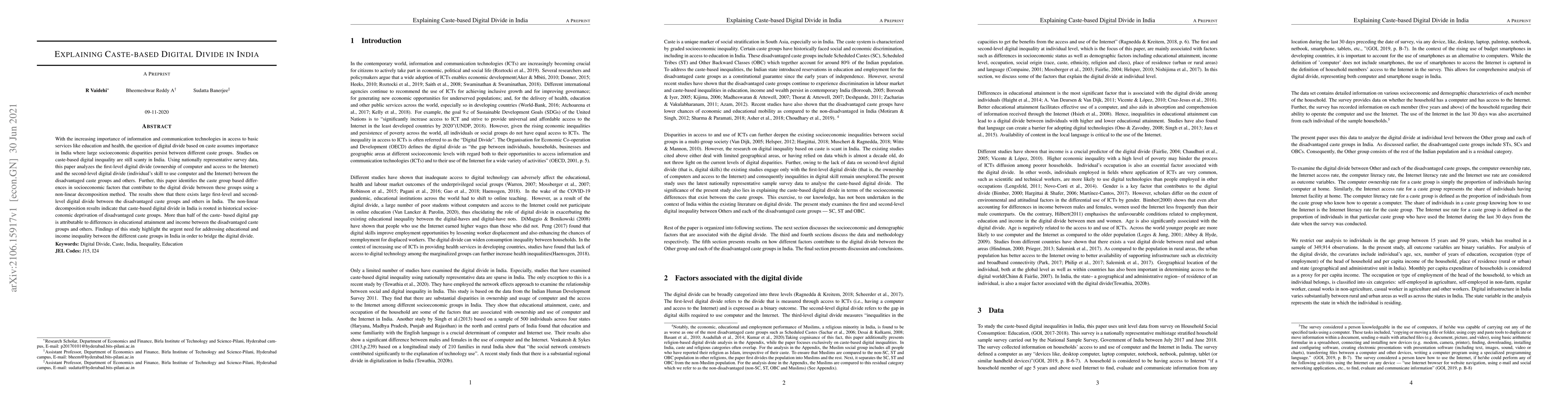 With the increasing importance of information and communication technologies in access to basic services like education and health, the question of the digital divide based on caste assumes importance in India where large socioeconomic disparities persist between different caste groups. Studies on caste-based digital inequality are still scanty in India. Using nationally representative survey data, this paper analyzes the first-level digital divide (ownership of computer and access to the internet) and the second-level digital divide (individual's skill to use computer and the internet) between the disadvantaged caste group and the others. Further, this paper identifies the caste group-based differences in socioeconomic factors that contribute to the digital divide between these groups using a non-linear decomposition method. The results show that there exists a large first-level and second-level digital divide between the disadvantaged caste groups and others in India. The non-linear decomposition results indicate that the caste-based digital divide in India is rooted in historical socioeconomic deprivation of disadvantaged caste groups. More than half of the caste-based digital gap is attributable to differences in educational attainment and income between the disadvantaged caste groups and others. The findings of this study highlight the urgent need for addressing educational and income inequality between the different caste groups in India in order to bridge the digital divide.