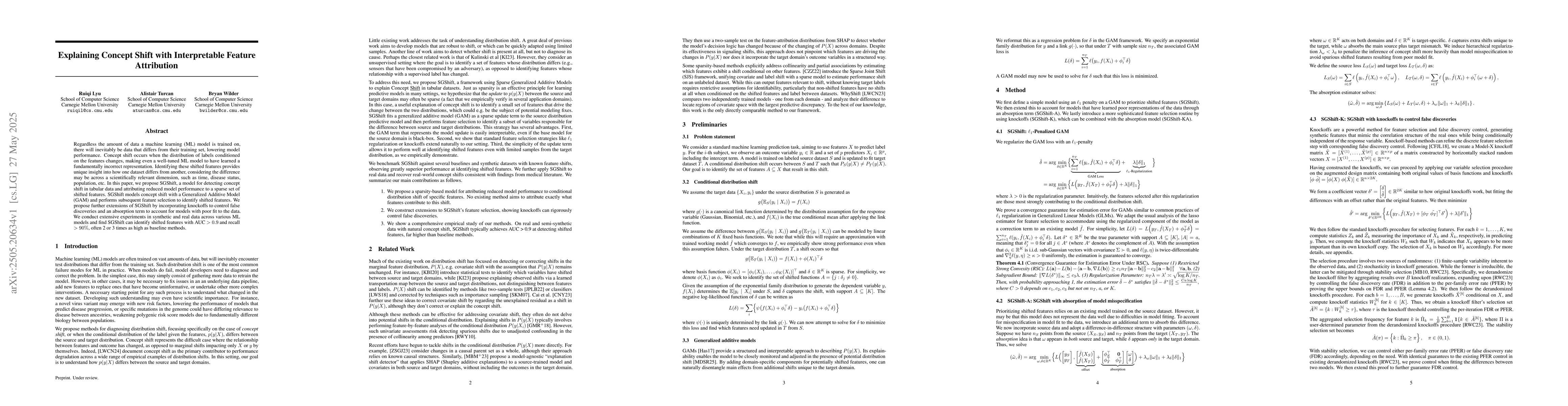 SGShift, a method combining GAM with feature selection for concept shift detection in tabular data, along with extensions using knockoffs and absorption terms.