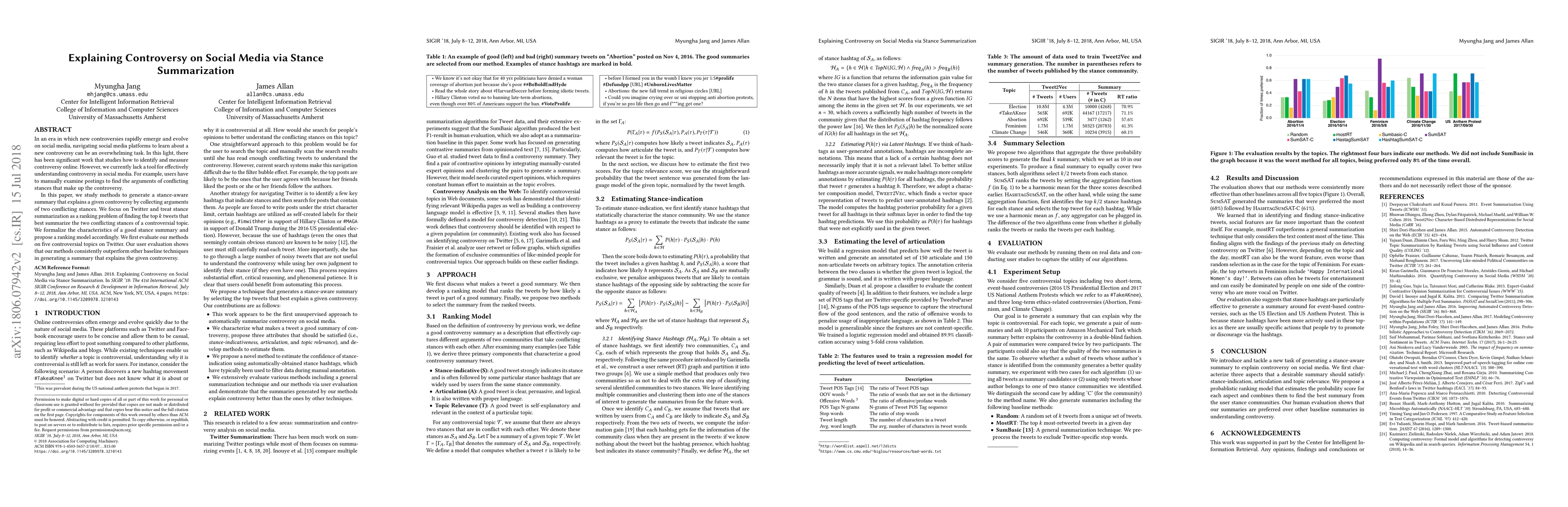 This paper proposes a method to generate stance-aware summaries for explaining controversies on social media, focusing on Twitter. The authors develop a ranking model to identify the top tweets that best represent conflicting stances, formalizing criteria for a good summary and showing through user evaluation that their approach outperforms baseline techniques.