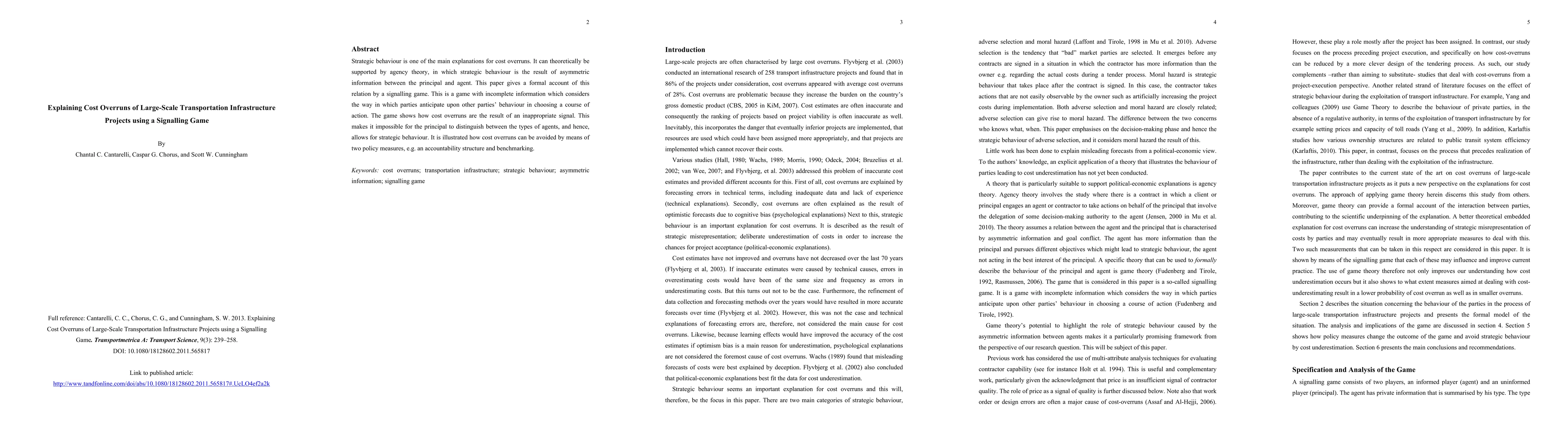This paper uses a signalling game to explain cost overruns in large-scale transportation projects, attributing them to strategic behaviour due to asymmetric information between parties. It proposes accountability structures and benchmarking as policy measures to mitigate these overruns.
