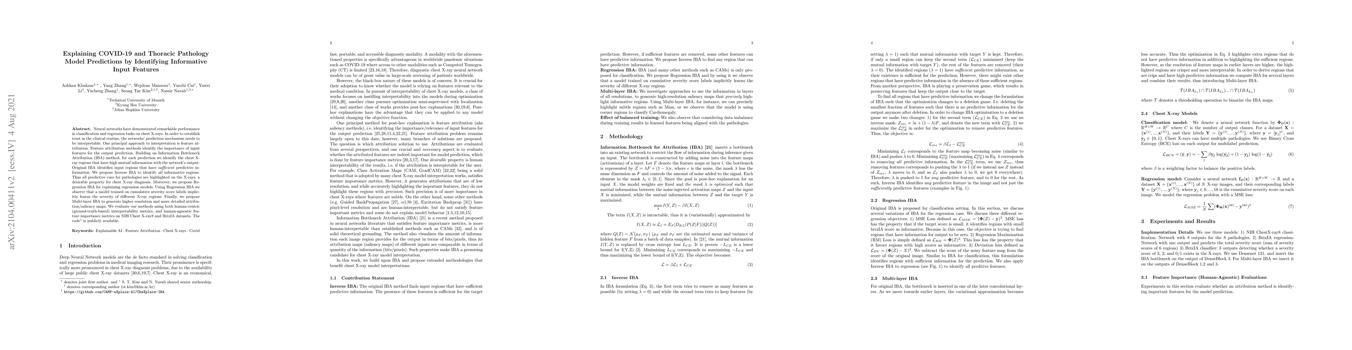 Neural networks have demonstrated remarkable performance in classification and regression tasks on chest X-rays. In order to establish trust in the clinical routine, the networks' prediction mechanism needs to be interpretable. One principal approach to interpretation is feature attribution. Feature attribution methods identify the importance of input features for the output prediction. Building on Information Bottleneck Attribution (IBA) method, for each prediction we identify the chest X-ray regions that have high mutual information with the network's output. Original IBA identifies input regions that have sufficient predictive information. We propose Inverse IBA to identify all informative regions. Thus all predictive cues for pathologies are highlighted on the X-rays, a desirable property for chest X-ray diagnosis. Moreover, we propose Regression IBA for explaining regression models. Using Regression IBA we observe that a model trained on cumulative severity score labels implicitly learns the severity of different X-ray regions. Finally, we propose Multi-layer IBA to generate higher resolution and more detailed attribution/saliency maps. We evaluate our methods using both human-centric (ground-truth-based) interpretability metrics, and human-independent feature importance metrics on NIH Chest X-ray8 and BrixIA datasets. The Code is publicly available.