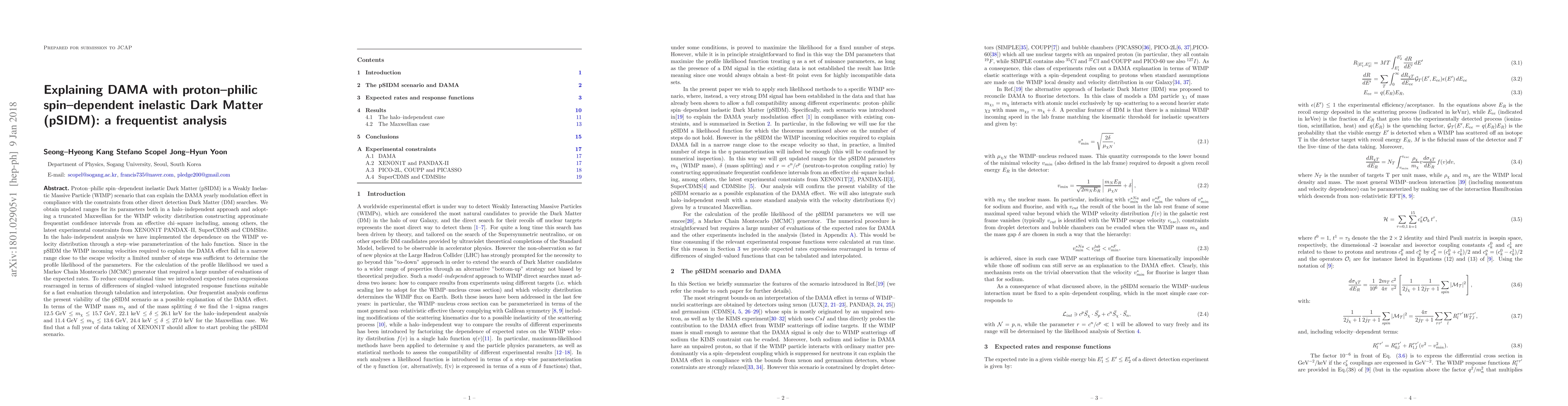 This paper presents a frequentist analysis of proton-philic spin-dependent inelastic Dark Matter (pSIDM) to explain the DAMA modulation effect, confirming its viability. The study provides updated parameter ranges for pSIDM, considering both halo-independent and Maxwellian velocity distributions, and predicts that XENON1T's full-year data will start probing this scenario.