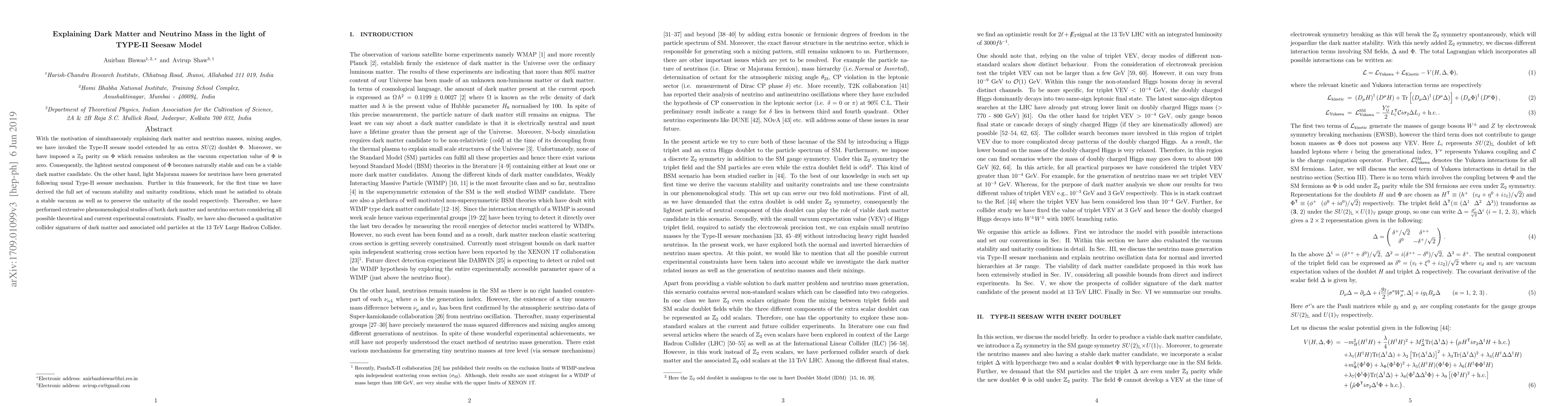 This paper proposes a Type-II seesaw model extended with an extra $SU(2)$ doublet $\Phi$ to explain dark matter and neutrino masses. The lightest neutral component of $\Phi$ serves as a stable dark matter candidate, while light Majorana masses for neutrinos are generated via the Type-II seesaw mechanism. The study also derives vacuum stability and unitarity conditions and discusses collider signatures for dark matter and associated particles.