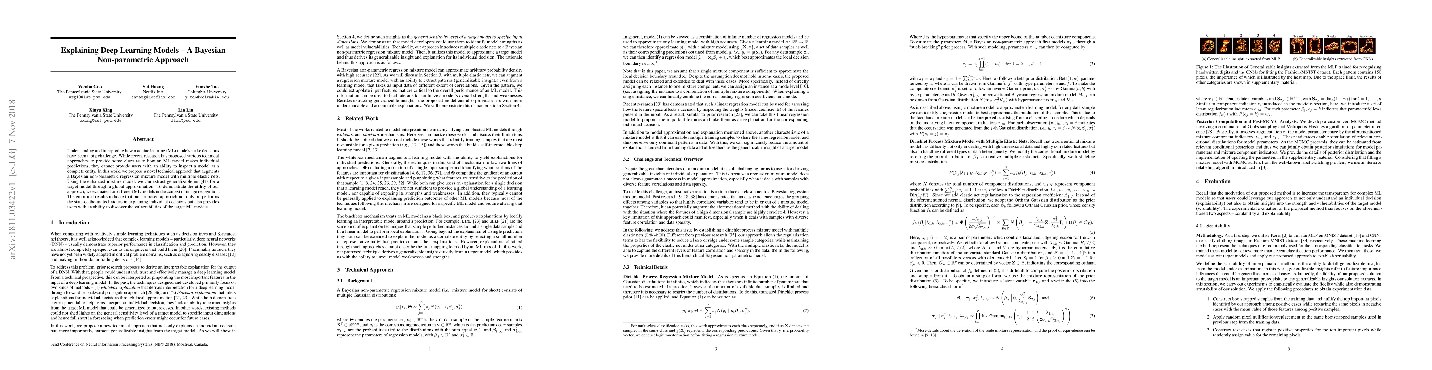 This paper proposes a Bayesian non-parametric regression mixture model enhanced with multiple elastic nets to provide a global approximation of deep learning models, offering insights into both individual predictions and model vulnerabilities. Empirical results show superior performance in explaining model decisions compared to existing techniques, particularly in image recognition tasks.