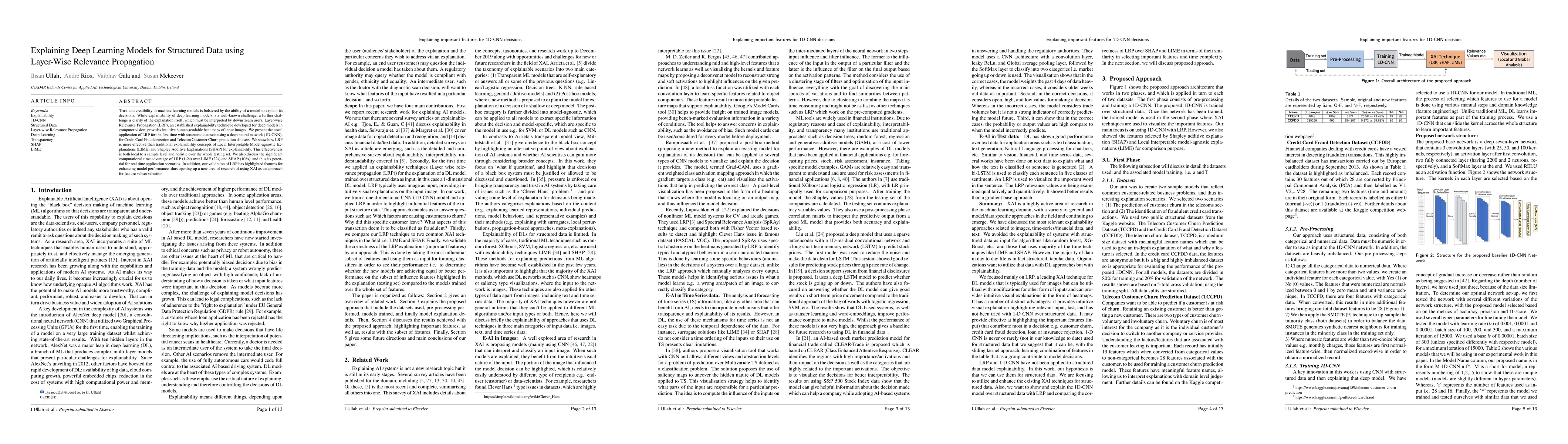 Trust and credibility in machine learning models is bolstered by the ability of a model to explain itsdecisions. While explainability of deep learning models is a well-known challenge, a further chal-lenge is clarity of the explanation itself, which must be interpreted by downstream users. Layer-wiseRelevance Propagation (LRP), an established explainability technique developed for deep models incomputer vision, provides intuitive human-readable heat maps of input images. We present the novelapplication of LRP for the first time with structured datasets using a deep neural network (1D-CNN),for Credit Card Fraud detection and Telecom Customer Churn prediction datasets. We show how LRPis more effective than traditional explainability concepts of Local Interpretable Model-agnostic Ex-planations (LIME) and Shapley Additive Explanations (SHAP) for explainability. This effectivenessis both local to a sample level and holistic over the whole testing set. We also discuss the significantcomputational time advantage of LRP (1-2s) over LIME (22s) and SHAP (108s), and thus its poten-tial for real time application scenarios. In addition, our validation of LRP has highlighted features forenhancing model performance, thus opening up a new area of research of using XAI as an approachfor feature subset selection