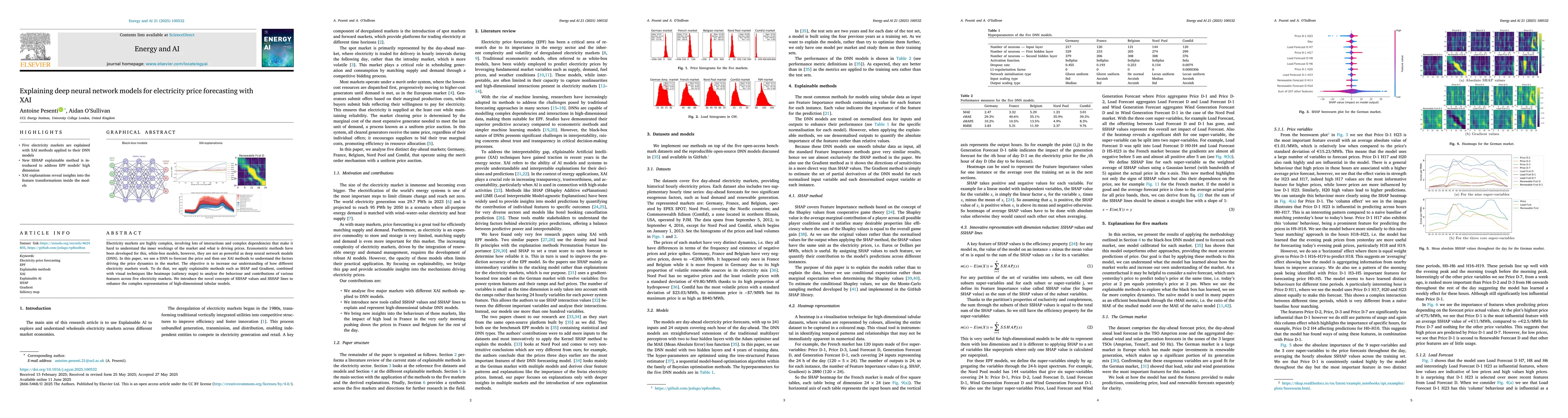 Electricity markets are highly complex, involving lots of interactions and complex dependencies that make it hard to understand the inner workings of the market and what is driving prices. Econometric methods have been developed for this, white-box models, however, they are not as powerful as deep neural network models (DNN). In this paper, we use a DNN to forecast the price and then use XAI methods to understand the factors driving the price dynamics in the market. The objective is to increase our understanding of how different electricity markets work. To do that, we apply explainable methods such as SHAP and Gradient, combined with visual techniques like heatmaps (saliency maps) to analyse the behaviour and contributions of various features across five electricity markets. We introduce the novel concepts of SSHAP values and SSHAP lines to enhance the complex representation of high-dimensional tabular models.
