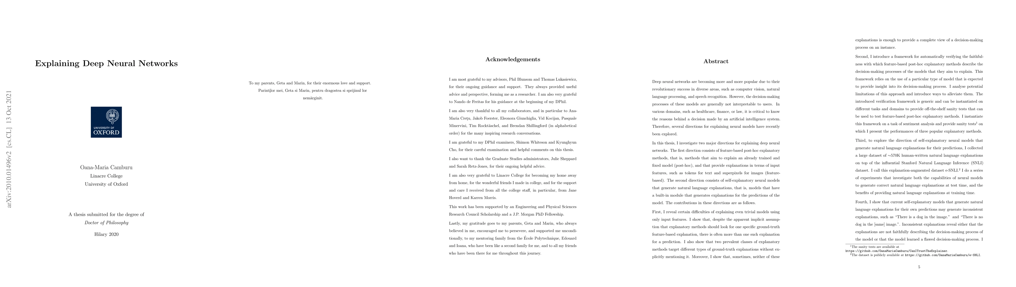 Deep neural networks are becoming more and more popular due to their revolutionary success in diverse areas, such as computer vision, natural language processing, and speech recognition. However, the decision-making processes of these models are generally not interpretable to users. In various domains, such as healthcare, finance, or law, it is critical to know the reasons behind a decision made by an artificial intelligence system. Therefore, several directions for explaining neural models have recently been explored. In this thesis, I investigate two major directions for explaining deep neural networks. The first direction consists of feature-based post-hoc explanatory methods, that is, methods that aim to explain an already trained and fixed model (post-hoc), and that provide explanations in terms of input features, such as tokens for text and superpixels for images (feature-based). The second direction consists of self-explanatory neural models that generate natural language explanations, that is, models that have a built-in module that generates explanations for the predictions of the model.