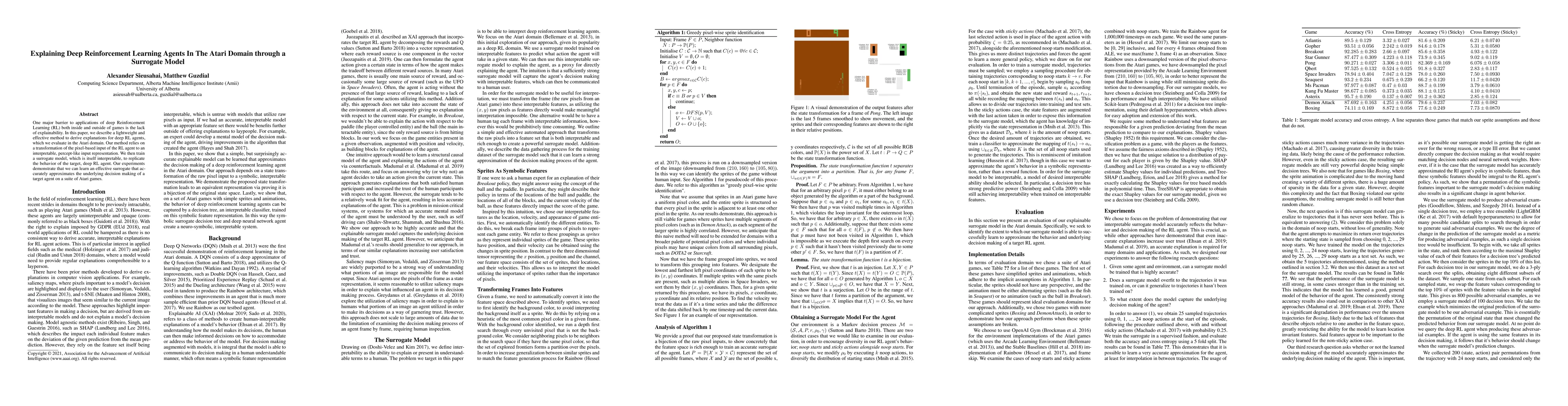 This paper proposes a method to explain deep reinforcement learning agents in the Atari domain by transforming their input to an interpretable representation and training an interpretable surrogate model to replicate their behavior. Experiments show that the surrogate model accurately approximates the target agent's decision-making across various Atari games.