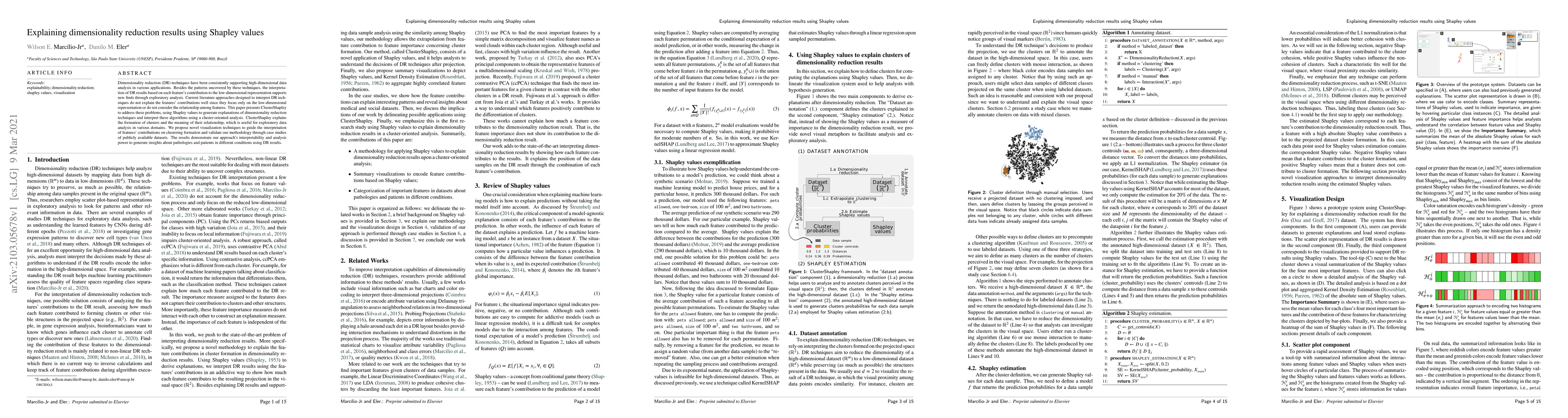 This paper introduces ClusterShapley, a method using Shapley values to interpret dimensionality reduction results by explaining each feature's contribution to the low-dimensional representation and cluster formation, offering novel visualization techniques for better exploratory data analysis. The approach is validated through case studies on publicly available datasets, demonstrating its interpretability and analytical power.