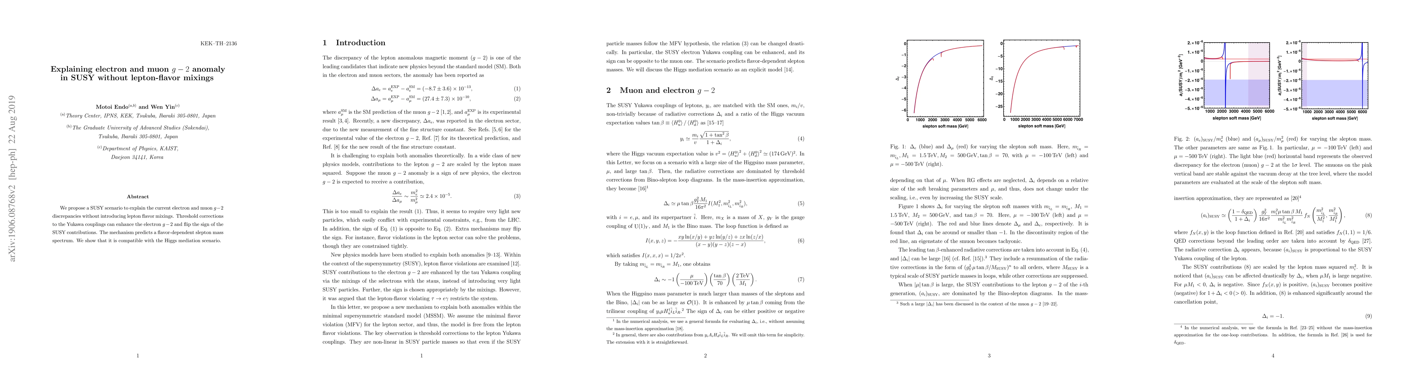 We propose a SUSY scenario to explain the current electron and muon $g-2$ discrepancies without introducing lepton flavor mixings. Threshold corrections to the Yukawa couplings can enhance the electron $g-2$ and flip the sign of the SUSY contributions. The mechanism predicts a flavor-dependent slepton mass spectrum. We show that it is compatible with the Higgs mediation scenario.