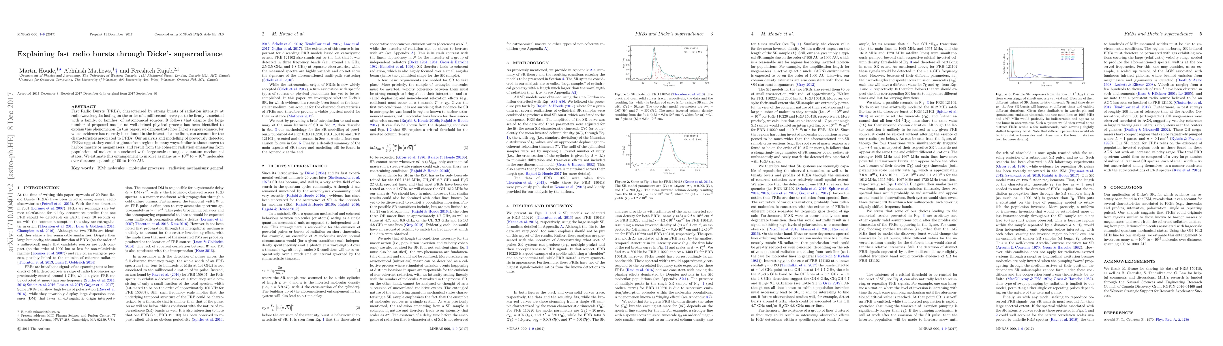 Fast Radio Bursts (FRBs), characterized by strong bursts of radiation intensity at radio wavelengths lasting on the order of a millisecond, have yet to be firmly associated with a family, or families, of astronomical sources. It follows that despite the large number of proposed models no well-defined physical process has been identified to explain this phenomenon. In this paper, we demonstrate how Dicke's superradiance, for which evidence has recently been found in the interstellar medium, can account for the characteristics associated to FRBs. Our analysis and modelling of previously detected FRBs suggest they could originate from regions in many ways similar to those known to harbor masers or megamasers, and result from the coherent radiation emanating from populations of molecules associated with large-scale entangled quantum mechanical states. We estimate this entanglement to involve as many as ~10^(30) to ~10^(32) molecules over distances spanning 100 to 1000 AU.