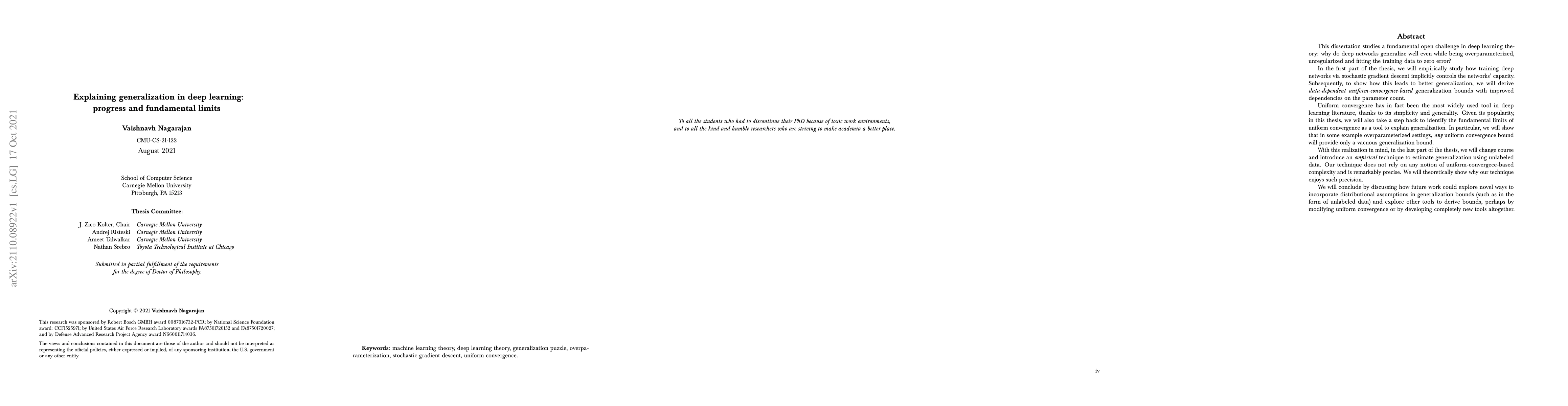 This dissertation investigates why deep networks generalize well despite being overparameterized and unregularized. It explores how stochastic gradient descent controls network capacity and provides improved generalization bounds. It also identifies the fundamental limits of uniform convergence in explaining generalization, introducing a novel empirical technique for precise generalization estimation using unlabeled data.