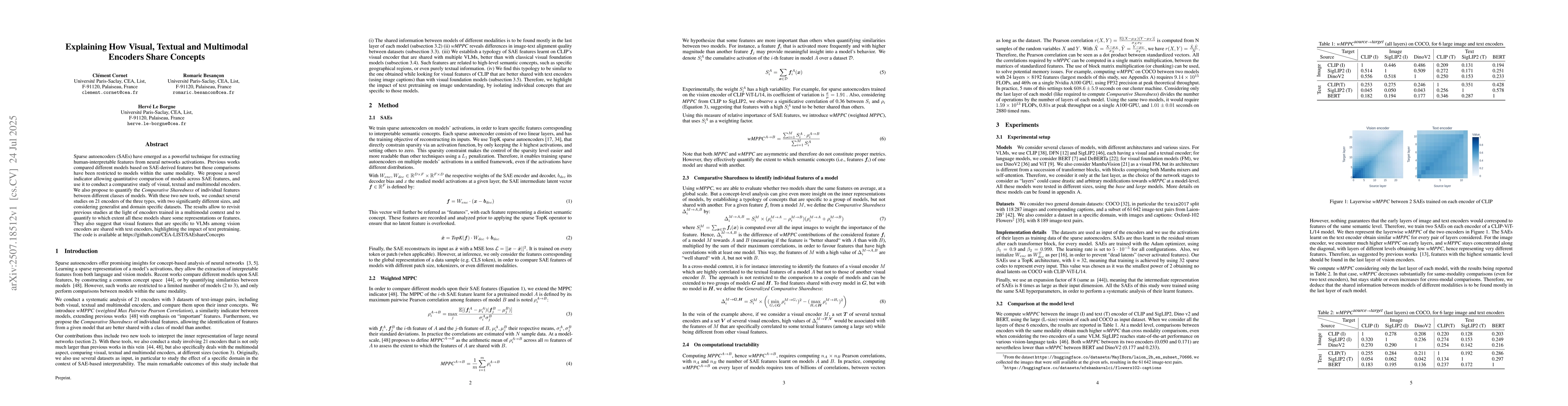 This research introduces a new method to compare models across different modalities using Sparse Autoencoder (SAE)-derived features. It quantifies 'Comparative Sharedness' of features among visual, textual, and multimodal encoders. Results indicate that visual features specific to Vision-Language Models (VLMs) are shared with text encoders, emphasizing the influence of text pretraining.