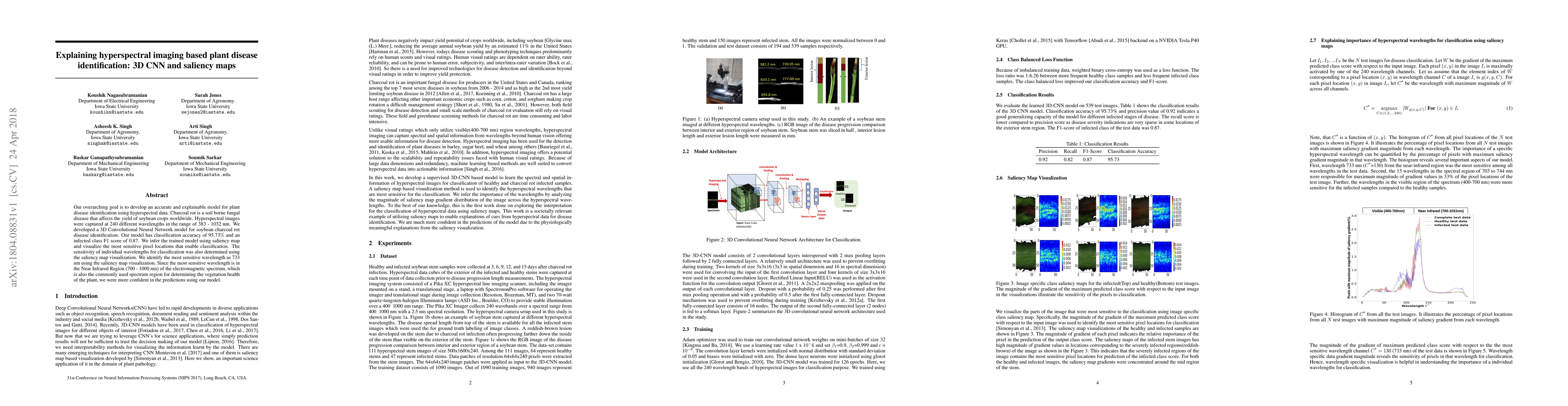 This paper develops a 3D Convolutional Neural Network model for identifying soybean charcoal rot disease using hyperspectral imaging data, achieving 95.73% accuracy. The model's predictions are explained using saliency maps, identifying 733 nm as the most sensitive wavelength in the Near Infrared Region for classification.
