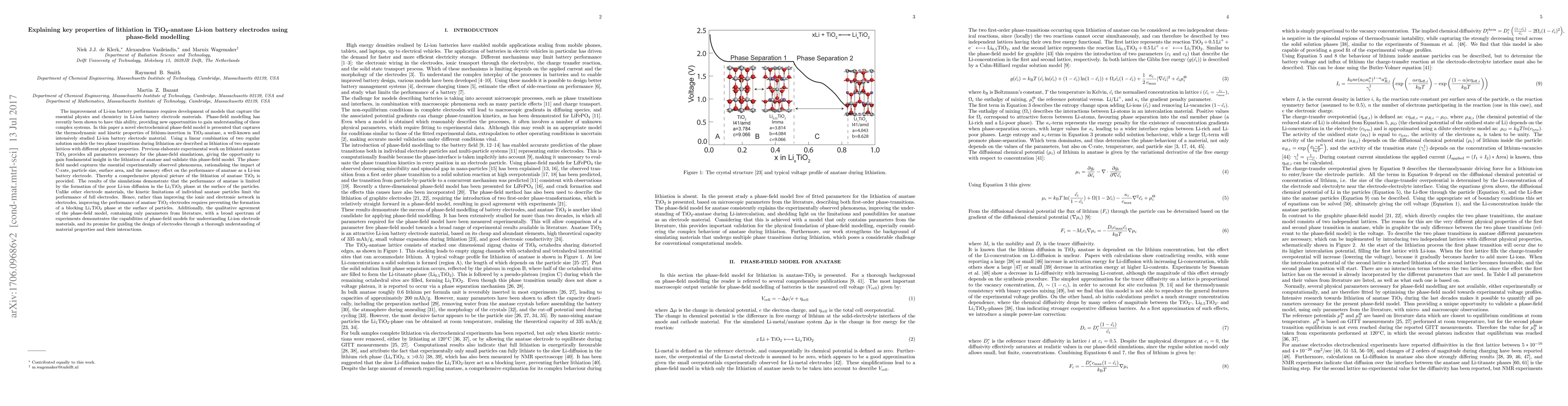 This paper develops a novel electrochemical phase-field model to understand the lithiation of TiO$_2$-anatase in Li-ion batteries, revealing that performance is limited by the formation of a blocking Li$_1$TiO$_2$ phase at particle surfaces. The model provides a comprehensive physical picture and suggests that improving electrode performance requires preventing this formation.