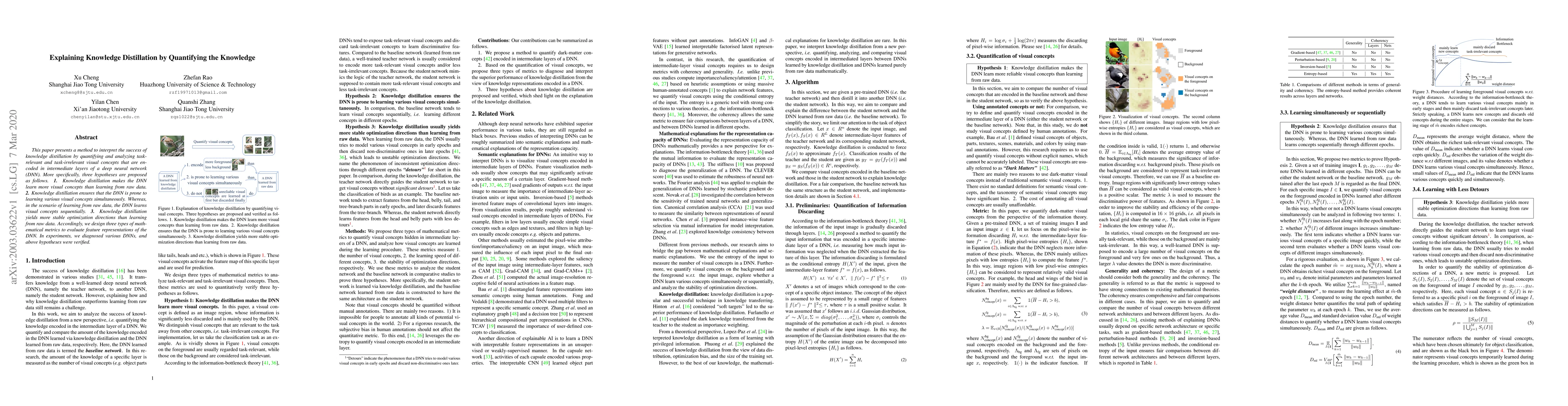 This paper proposes a method to interpret knowledge distillation by quantifying task-relevant and task-irrelevant visual concepts in DNNs, verifying three hypotheses: distillation enhances concept learning, enables simultaneous concept learning, and yields more stable optimization. Experiments confirm these hypotheses through mathematical metrics.