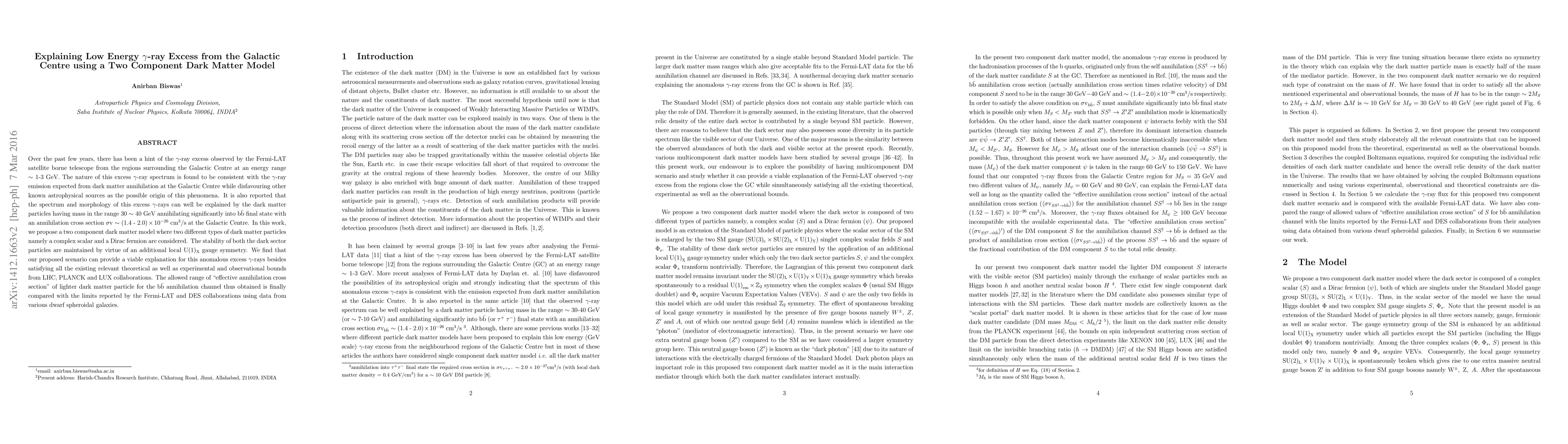 Over the past few years, there has been a hint of the $\gamma$-ray excess observed by the Fermi-LAT satellite borne telescope from the regions surrounding the Galactic Centre at an energy range $\sim 1$-$3$ GeV. The nature of this excess $\gamma$-ray spectrum is found to be consistent with the $\gamma$-ray emission expected from dark matter annihilation at the Galactic Centre while disfavouring other known astrophysical sources as the possible origin of this phenomena. It is also reported that the spectrum and morphology of this excess $\gamma$-rays can well be explained by the dark matter particles having mass in the range $30\sim 40$ GeV annihilating significantly into ${\rm b} \bar{\rm b}$ final state with an annihilation cross section $\sigma {\rm v}\sim (1.4$ - $2.0)\times 10^{-26}$ cm$^3/$s at the Galactic Centre. In this work, we propose a two component dark matter model where two different types of dark matter particles namely a complex scalar and a Dirac fermion are considered. The stability of both the dark sector particles are maintained by virtue of an additional local U$(1)_{\rm X}$ gauge symmetry. We find that our proposed scenario can provide a viable explanation for this anomalous excess $\gamma$-rays besides satisfying all the existing relevant theoretical as well as experimental and observational bounds from LHC, PLANCK and LUX collaborations. The allowed range of "effective annihilation cross section" of lighter dark matter particle for the ${\rm b} \bar{\rm b}$ annihilation channel thus obtained, is finally compared with the limits reported by the Fermi-LAT and DES collaborations using data from various dwarf spheroidal galaxies.