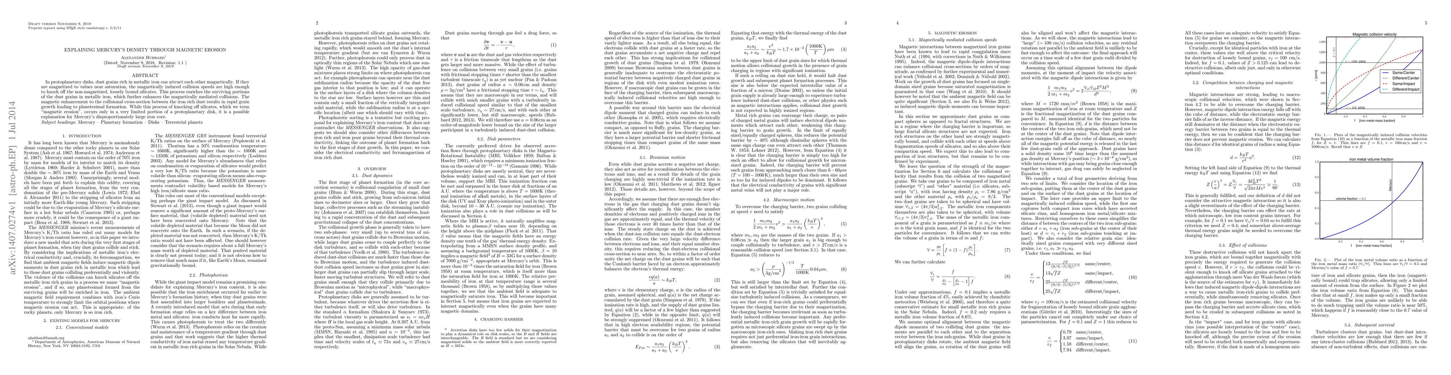 This paper proposes that "magnetic erosion" in protoplanetary disks, where magnetically saturated iron grains collide and remove silicates, could explain Mercury's high density due to the formation of iron-rich planetesimals. This process occurs in a specific region of the disk, contributing to Mercury's large iron core.
