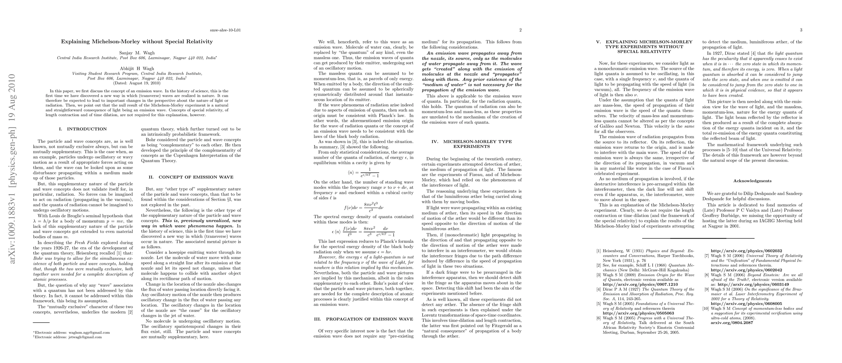 This paper introduces the concept of an emission wave to explain the null result of the Michelson-Morley experiment without invoking special relativity, suggesting that light as an emission wave naturally leads to the observed outcome. It proposes a new perspective on the nature of light that does not require length contraction or time dilation.