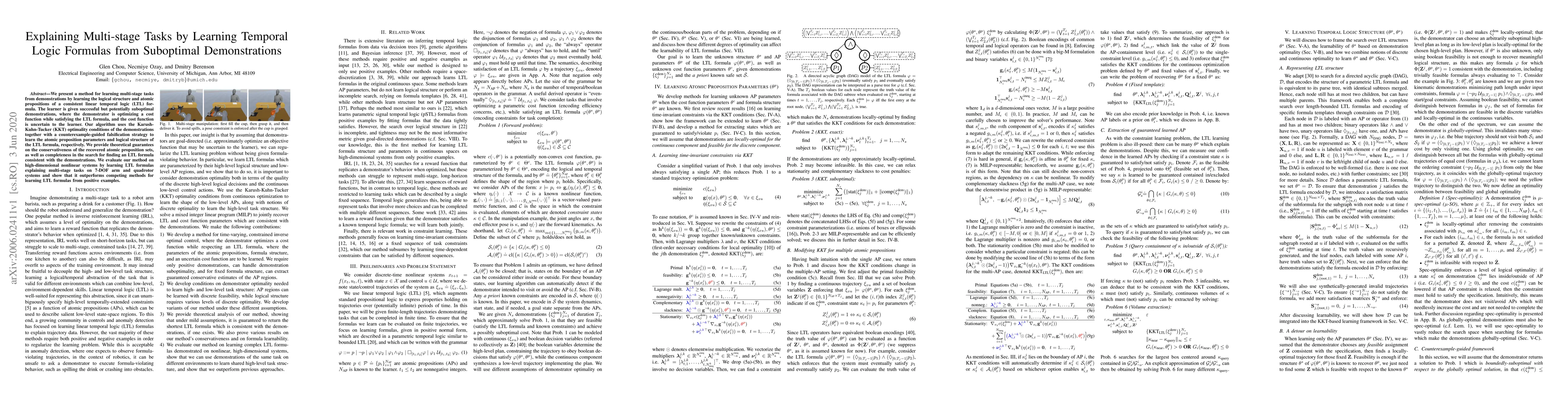 This paper proposes a method to learn multi-stage tasks by deriving linear temporal logic (LTL) formulas from suboptimal demonstrations, using KKT conditions and falsification strategies. The approach guarantees the recovery of consistent atomic propositions and outperforms other methods in high-dimensional systems.