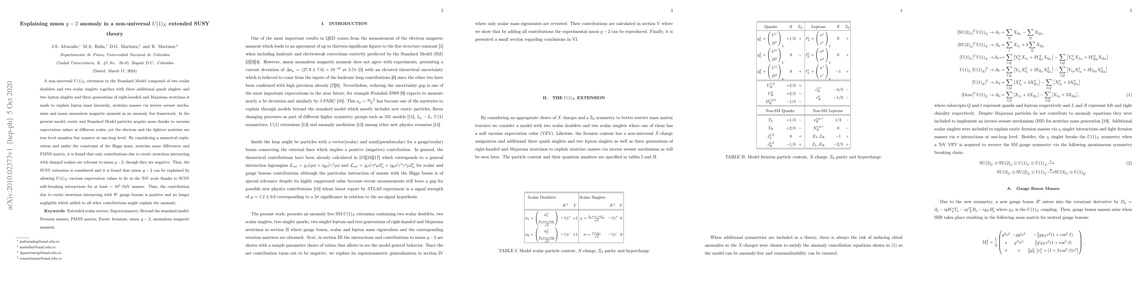 This paper proposes a non-universal $U(1)_{X}$ extended SUSY theory to explain the muon $g-2$ anomaly, lepton mass hierarchy, and neutrino masses via the inverse seesaw mechanism. The model includes exotic neutrinos interacting with charged scalars, whose contributions, though initially negative, become positive with SUSY extensions, potentially resolving the muon $g-2$ anomaly.