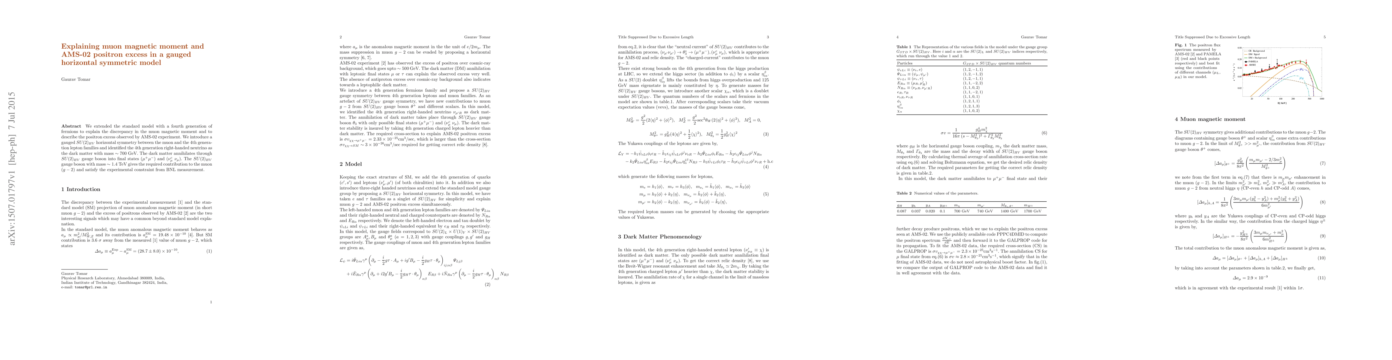 We extended the standard model with a fourth generation of fermions to explain the discrepancy in the muon magnetic moment and to describe the positron excess observed by AMS-02 experiment. We introduce a gauged $SU(2)_{HV}$ horizontal symmetry between the muon and the 4th generation lepton families and identified the 4th generation right-handed neutrino as the dark matter with mass $\sim 700$ GeV. The dark matter annihilates through $SU(2)_{HV}$ gauge boson into final states $(\mu^+ \mu^-)$ and $(\nu^c_\mu ~\nu_\mu)$. The $SU(2)_{HV}$ gauge boson with mass $\sim 1.4$ TeV gives the required contribution to the muon $(g-2)$ and satisfy the experimental constraint from BNL measurement.