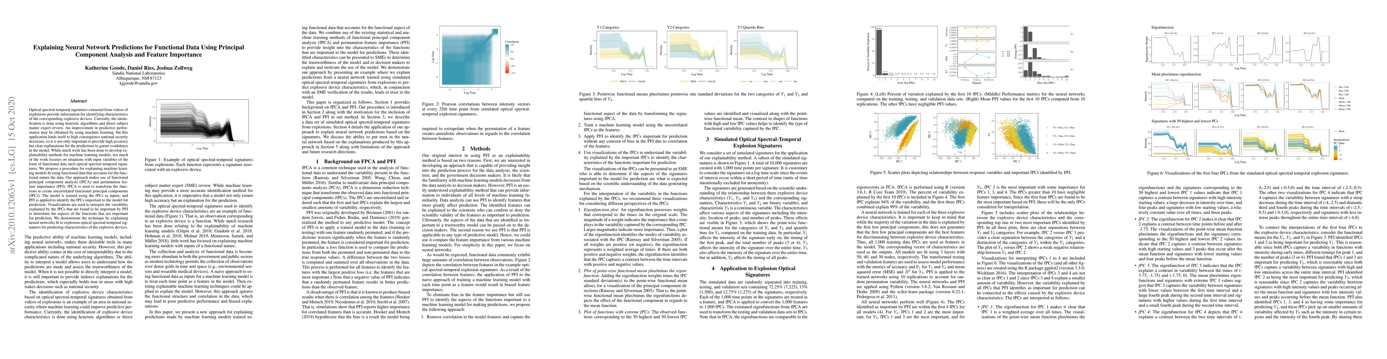 This paper proposes a method to explain neural network predictions for functional data, specifically optical spectral-temporal signatures from explosion videos, using functional principal component analysis (fPCA) and permutation feature importance (PFI). The approach transforms the data into uncorrelated functional principal components and identifies important components for prediction, providing clear explanations to enhance model confidence in high-consequence national security applications.