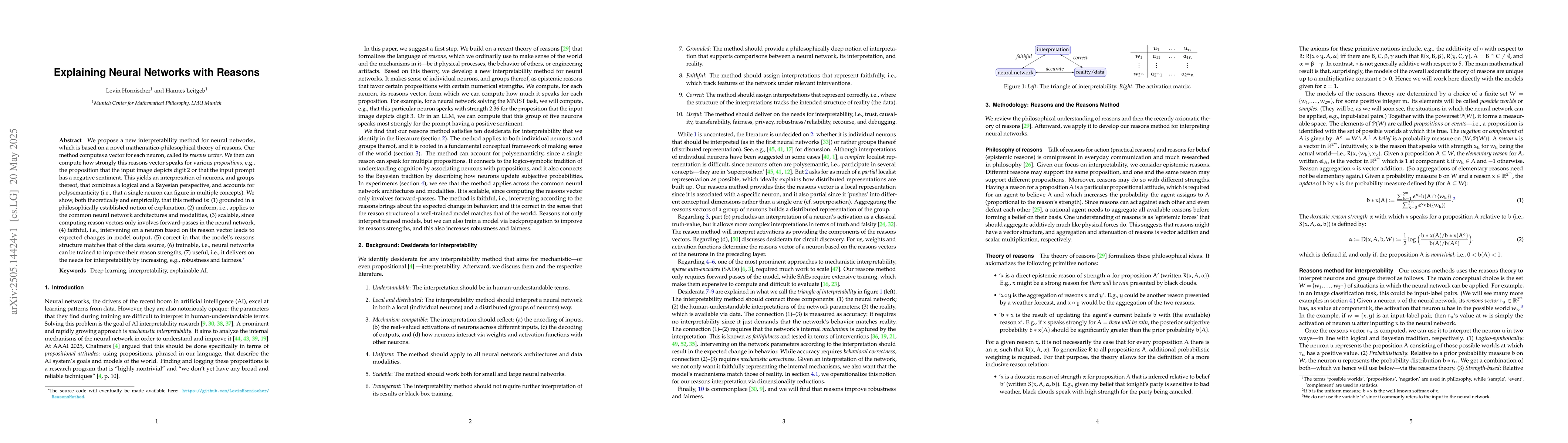 We propose a new interpretability method for neural networks, which is based on a novel mathematico-philosophical theory of reasons. Our method computes a vector for each neuron, called its reasons vector. We then can compute how strongly this reasons vector speaks for various propositions, e.g., the proposition that the input image depicts digit 2 or that the input prompt has a negative sentiment. This yields an interpretation of neurons, and groups thereof, that combines a logical and a Bayesian perspective, and accounts for polysemanticity (i.e., that a single neuron can figure in multiple concepts). We show, both theoretically and empirically, that this method is: (1) grounded in a philosophically established notion of explanation, (2) uniform, i.e., applies to the common neural network architectures and modalities, (3) scalable, since computing reason vectors only involves forward-passes in the neural network, (4) faithful, i.e., intervening on a neuron based on its reason vector leads to expected changes in model output, (5) correct in that the model's reasons structure matches that of the data source, (6) trainable, i.e., neural networks can be trained to improve their reason strengths, (7) useful, i.e., it delivers on the needs for interpretability by increasing, e.g., robustness and fairness.