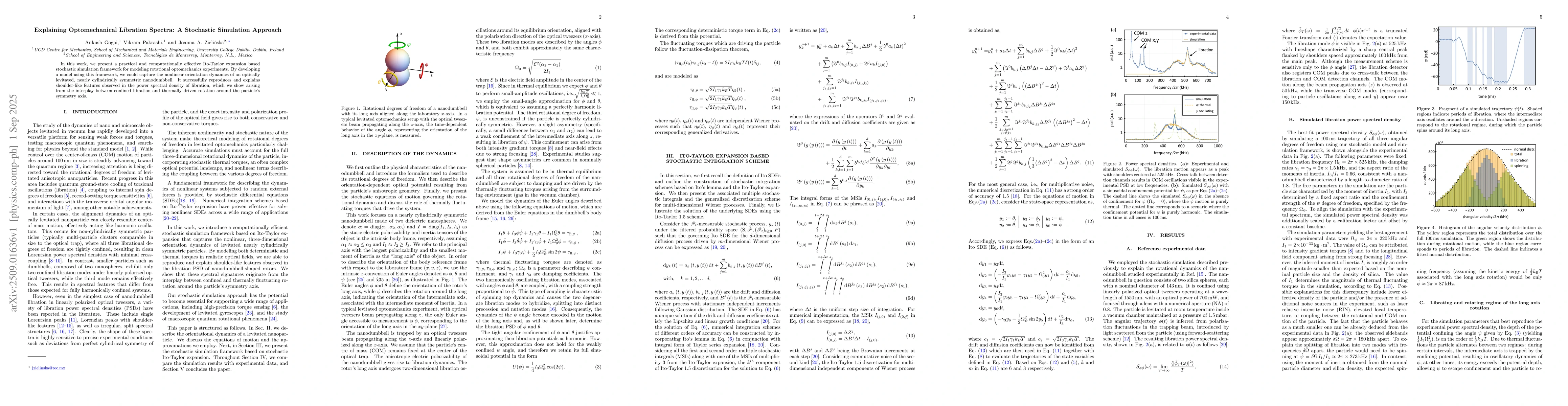 We present a practical and computationally effective Ito-Taylor expansion based stochastic simulation framework for modeling rotational optomechanics experiments. By developing a model using this framework, we could capture the nonlinear orientation dynamics of an optically levitated, nearly cylindrically symmetric nanodumbbell. It successfully reproduces and explains shoulder-like features observed in the power spectral density of libration, which we show arising from the interplay between confined libration and thermally driven rotation around the particle symmetry axis.
