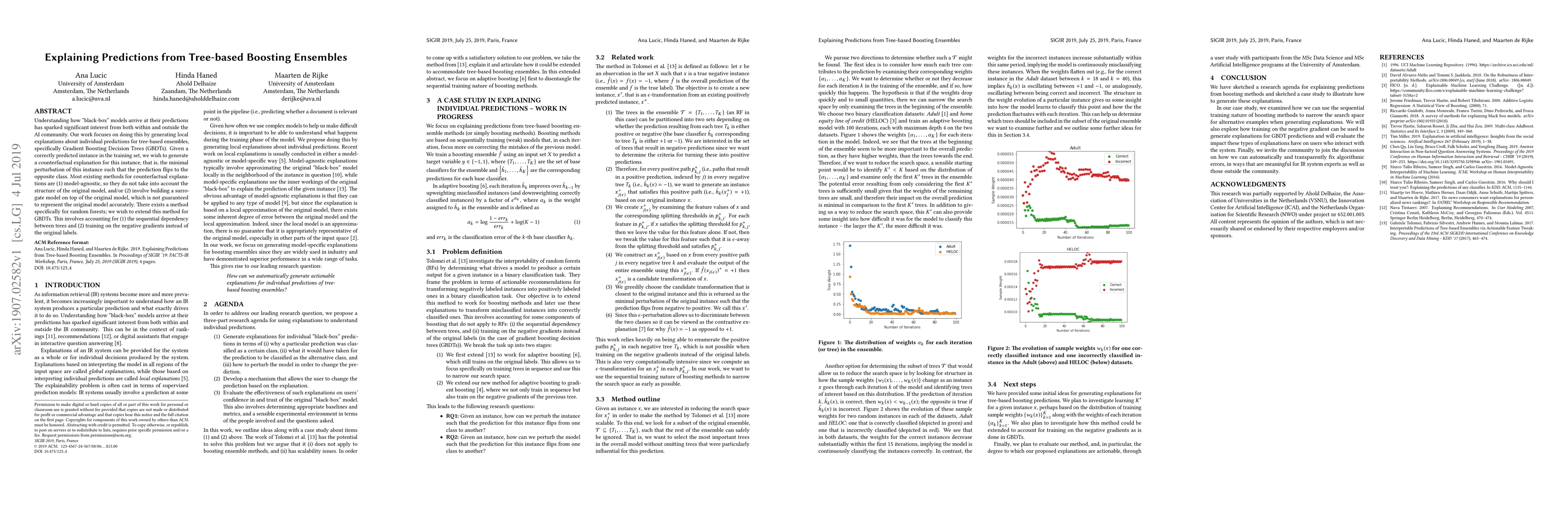This paper explores methods for explaining predictions made by Gradient Boosting Decision Trees (GBDTs) by generating counterfactual explanations that show the minimal perturbation needed to flip a prediction from one class to another.