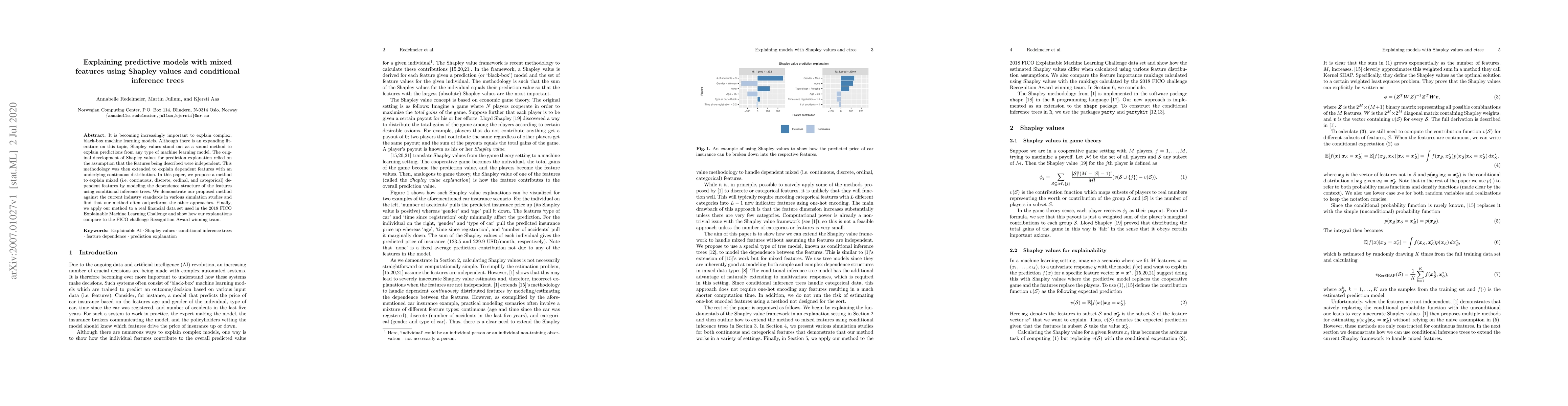 This paper proposes a method to explain predictions from complex machine learning models using Shapley values and conditional inference trees to account for mixed feature dependencies. The authors demonstrate superior performance of their approach in simulation studies and a real-world financial dataset compared to existing methods.