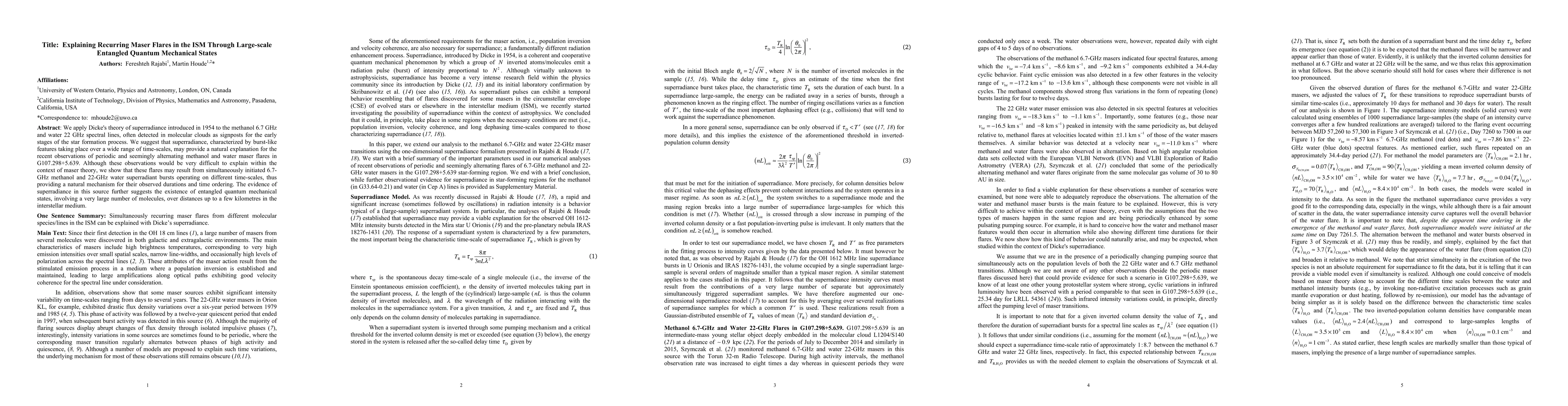 Research suggests maser flares in molecular clouds may result from simultaneous superradiant bursts of different frequencies on varying time scales, indicating entangled quantum mechanical states.