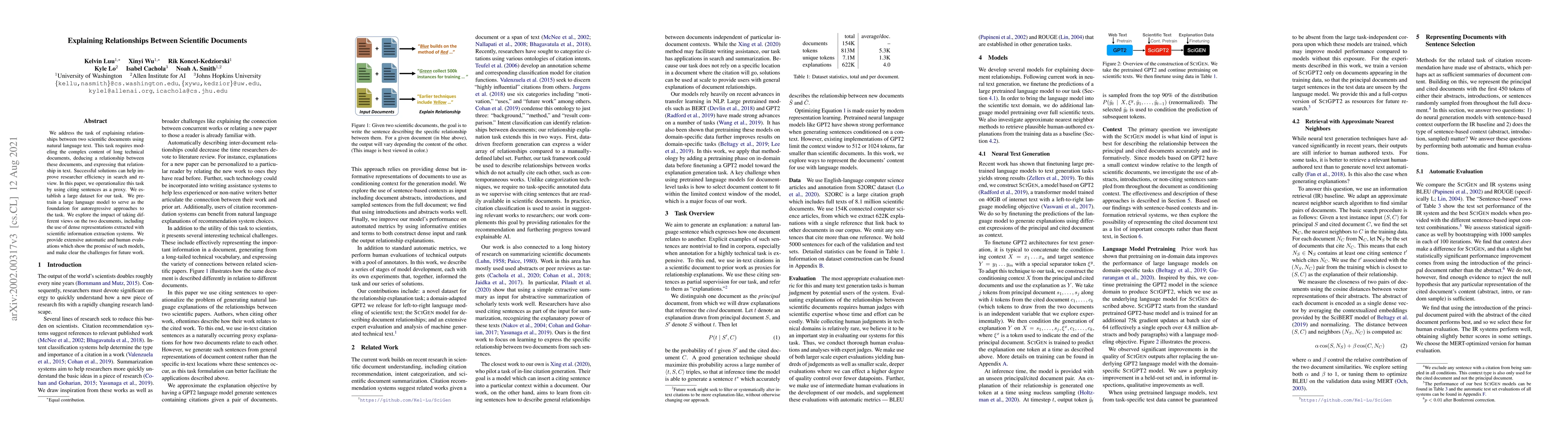 This paper develops a dataset and pretrains a large language model to explain relationships between scientific documents, aiming to improve researcher efficiency. It explores various document representations and provides both automatic and human evaluations, highlighting potential and challenges for future work.