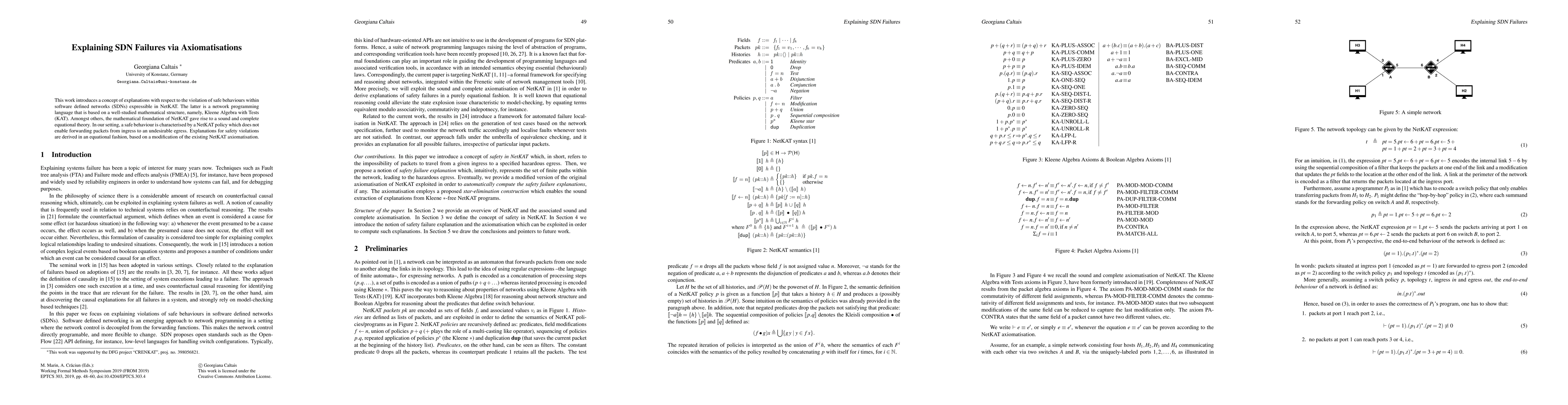 Researchers introduce a new method to explain failures in Software Defined Networks (SDNs) using NetKAT, a network programming language that provides an equational theory for safety violations. The approach uses a modified axiomatisation to derive explanations for safety violations.