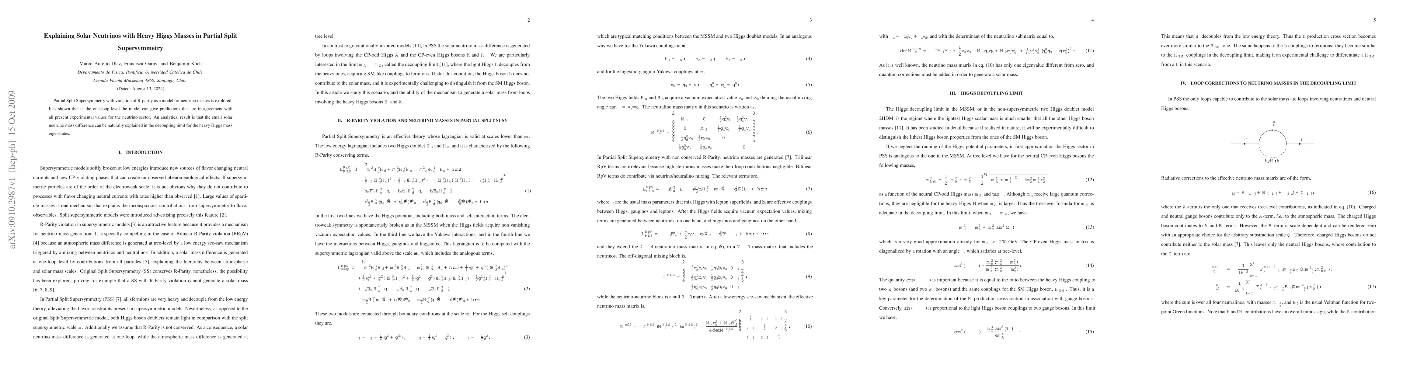 This paper explores Partial Split Supersymmetry (SPSS) with R-parity violation to explain solar neutrinos. The model predicts agreement with experimental neutrino values and naturally explains the small solar neutrino mass difference through heavy Higgs mass eigenstates in the decoupling limit.