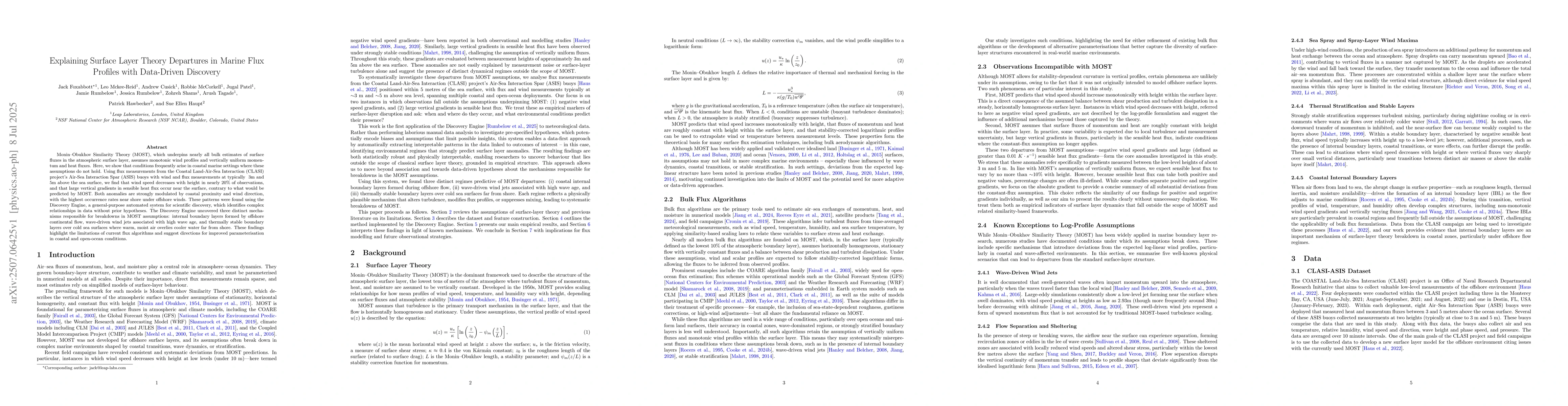Monin--Obukhov Similarity Theory (MOST), which underpins nearly all bulk estimates of surface fluxes in the atmospheric surface layer, assumes monotonic wind profiles and vertically uniform momentum and heat fluxes. Here, we show that conditions frequently arise in coastal marine settings where these assumptions do not hold. Using flux measurements from the Coastal Land-Air-Sea Interaction (CLASI) project's Air-Sea Interaction Spar (ASIS) buoys with wind and flux measurements at typically ~3m and ~5m above the sea surface, we find that wind speed decreases with height in nearly 20% of observations, and that large vertical gradients in sensible heat flux occur near the surface, contrary to what would be predicted by MOST. Both anomalies are strongly modulated by coastal proximity and wind direction, with the highest occurrence rates near shore under offshore winds. These patterns were found using the Discovery Engine, a general-purpose automated system for scientific discovery, which identifies complex relationships in data without prior hypotheses. The Discovery Engine uncovered three distinct mechanisms responsible for breakdowns in MOST assumptions: internal boundary layers formed by offshore continental flow, wave-driven wind jets associated with high wave age, and thermally stable boundary layers over cold sea surfaces where warm, moist air overlies cooler water far from shore. These findings highlight the limitations of current flux algorithms and suggest directions for improved parameterisation in coastal and open-ocean conditions.