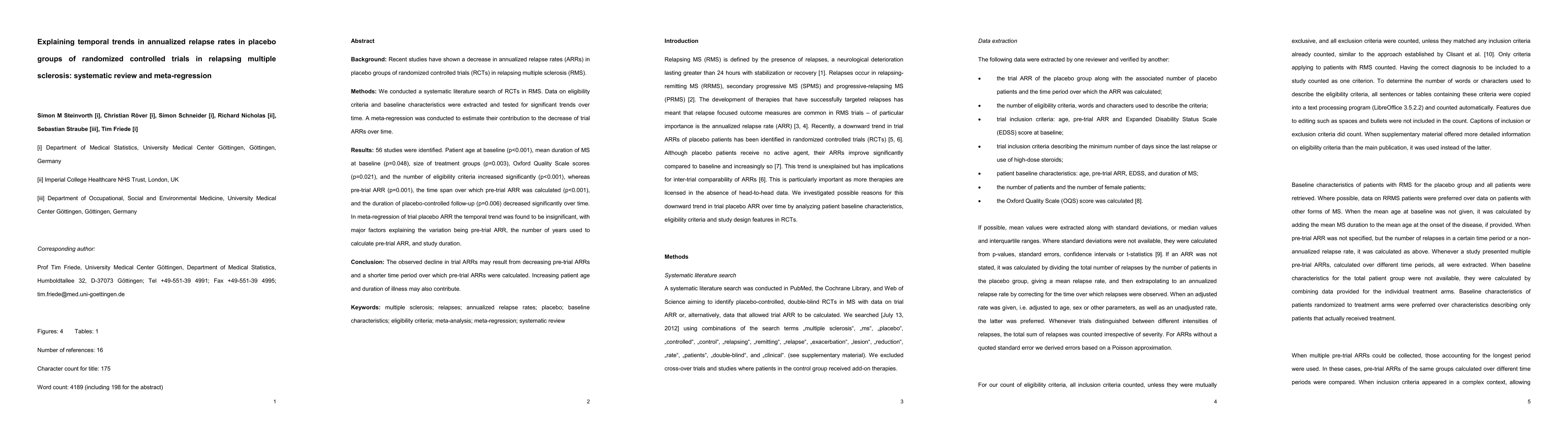 This paper systematically reviews and analyzes temporal trends in annualized relapse rates (ARRs) in placebo groups of randomized controlled trials in relapsing multiple sclerosis, finding that decreasing pre-trial ARRs and shorter calculation periods, along with increasing patient age and disease duration, contribute to the observed decline in trial ARRs. Meta-regression indicates these factors are significant, while the temporal trend itself is insignificant.