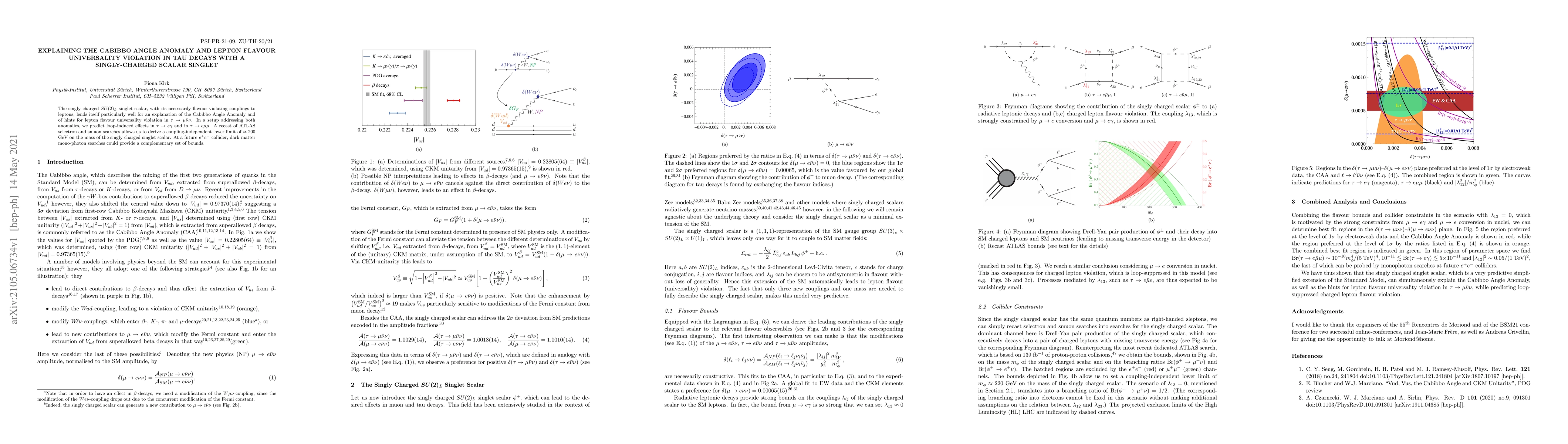The singly charged $SU(2)_L$ singlet scalar, with its necessarily flavour violating couplings to leptons, lends itself particularly well for an explanation of the Cabibbo Angle Anomaly and of hints for lepton flavour universality violation in $\tau \to \mu\bar \nu\nu$. In a setup addressing both anomalies, we predict loop-induced effects in $\tau\to e\gamma$ and in $\tau \to e\mu\mu$. A recast of ATLAS selectron and smuon searches allows us to derive a coupling-independent lower limit of $\approx 200$ GeV on the mass of the singly charged singlet scalar. At a future $e^+e^-$ collider, dark matter mono-photon searches could provide a complementary set of bounds.