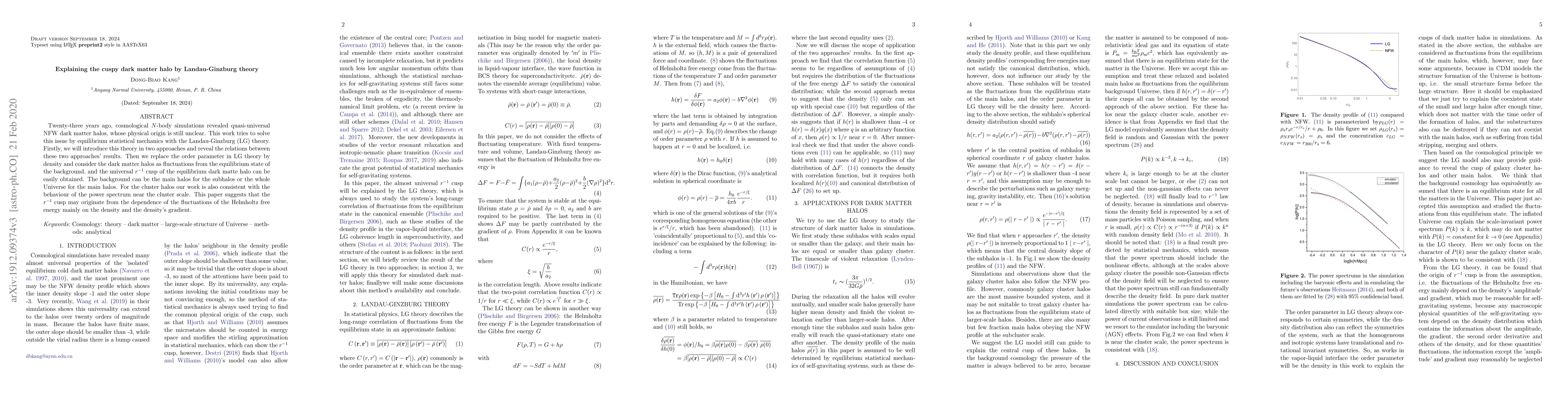 Twenty three years ago, cosmological N-body simulations revealed quasi-universal NFW dark matter halos, whose physical origin is still unclear. This work tries to solve this issue by Landau-Ginzburg (LG) theory in equilibrium statistical mechanics. We replace the order parameter in LG theory by density and consider the dark matter halos as fluctuations from the equilibrium state of the background, which can be the main halos for the subhalos, or the homogeneous and isotropic Universe for the galaxy cluster halos. With the assumption that the fluctuations of Helmholtz free energy depend mainly on the density and its gradient, which is shown to be consistent with the behavior of the power spectrum near the cluster scale, we can easily obtain the universal $r^{-1}$ cusp of the equilibrium dark matte halo without other requirements. This work strongly suggests that more studies should be done for the self-gravitating systems by statistical mechanics.