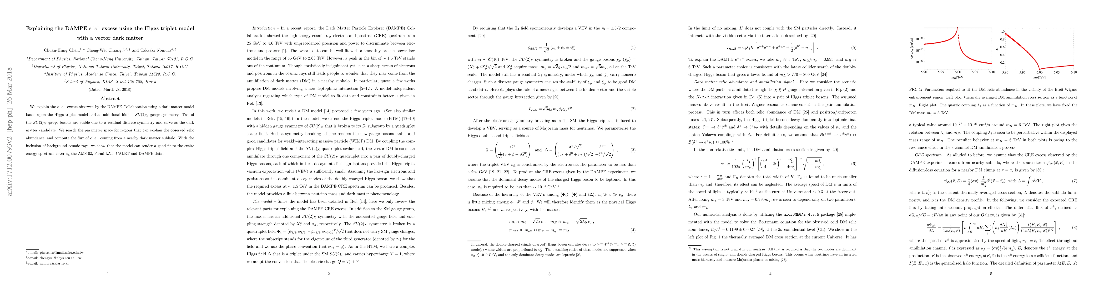 This paper proposes a Higgs triplet model with an $SU(2)_X$ gauge symmetry to explain the $e^+ e^-$ excess observed by DAMPE, using stable $SU(2)_X$ gauge bosons as dark matter. The model fits the observed relic abundance and the $e^+ e^-$ flux from dark matter subhalos, providing a good fit to AMS-02, Fermi-LAT, and DAMPE data when accounting for cosmic ray backgrounds.