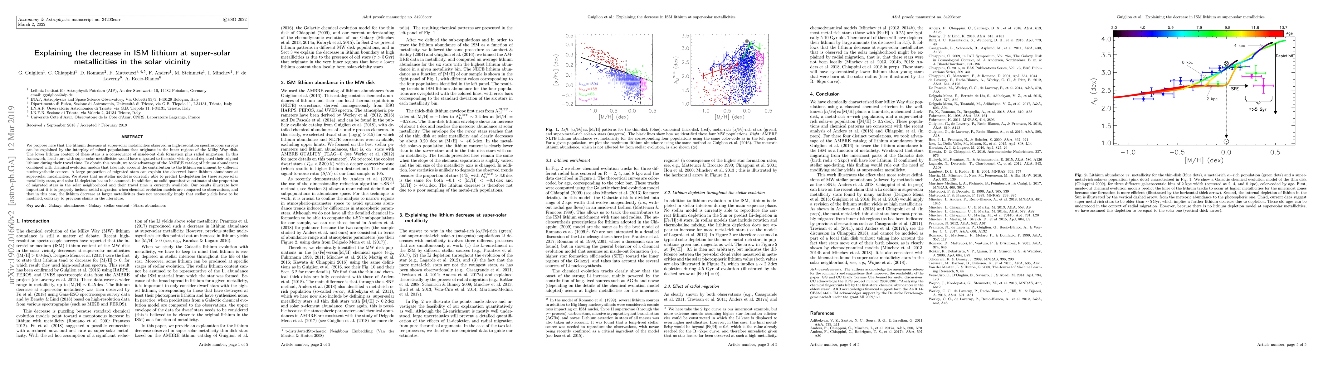 This paper explains the decrease in lithium (ISM lithium) at super-solar metallicities in the solar vicinity through the migration of stars from the inner Milky Way disc, attributing the lower lithium content to inside-out disc formation and radial migration. It emphasizes the importance of including radial migration in chemical evolution models to accurately interpret observations.