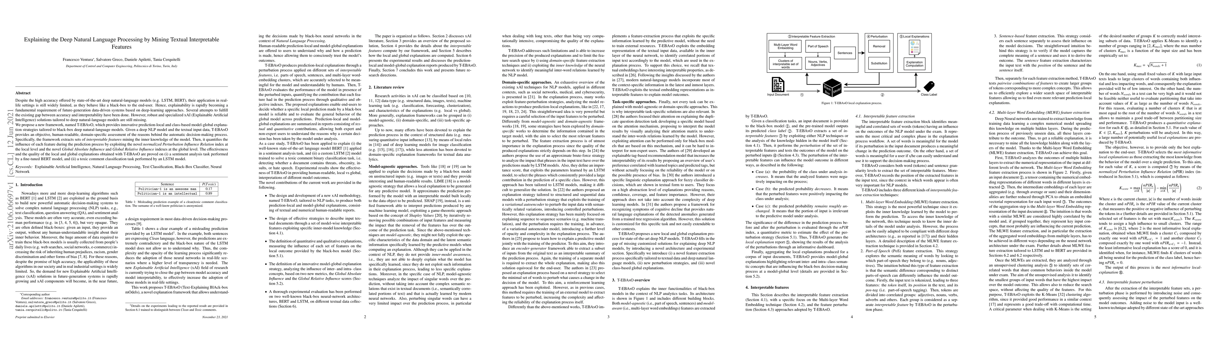 This paper introduces T-EBAnO, a framework for providing interpretable explanations for deep natural-language processing models, addressing the gap between high accuracy and lack of explainability. It uses novel indices to quantify feature influence and offers both local and global explanations for model decisions.