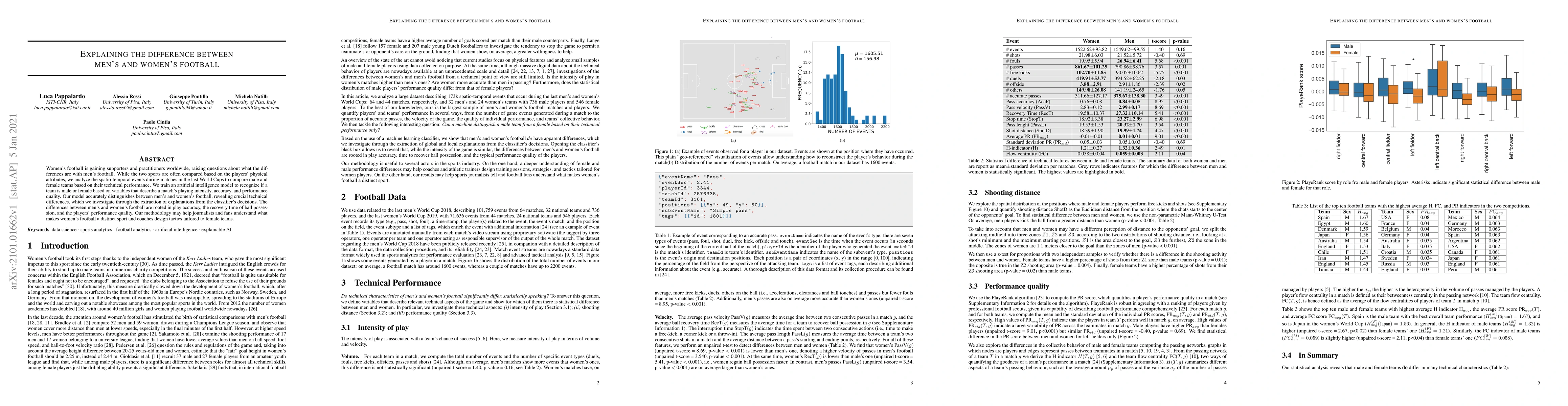 Women's football is gaining supporters and practitioners worldwide, raising questions about what the differences are with men's football. While the two sports are often compared based on the players' physical attributes, we analyze the spatio-temporal events during matches in the last World Cups to compare male and female teams based on their technical performance. We train an artificial intelligence model to recognize if a team is male or female based on variables that describe a match's playing intensity, accuracy, and performance quality. Our model accurately distinguishes between men's and women's football, revealing crucial technical differences, which we investigate through the extraction of explanations from the classifier's decisions. The differences between men's and women's football are rooted in play accuracy, the recovery time of ball possession, and the players' performance quality. Our methodology may help journalists and fans understand what makes women's football a distinct sport and coaches design tactics tailored to female teams.