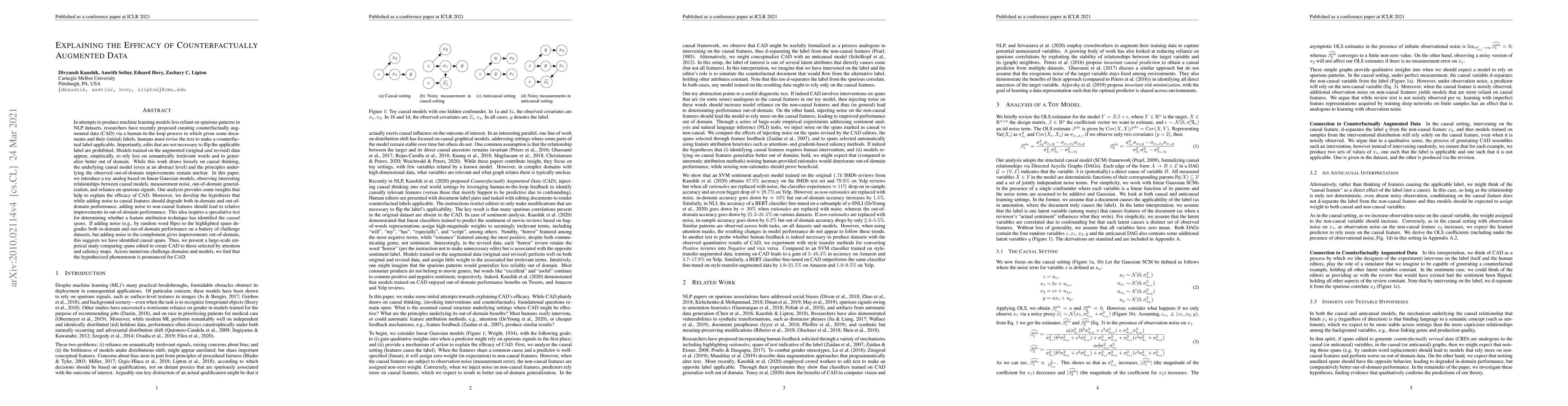 In attempts to produce ML models less reliant on spurious patterns in NLP datasets, researchers have recently proposed curating counterfactually augmented data (CAD) via a human-in-the-loop process in which given some documents and their (initial) labels, humans must revise the text to make a counterfactual label applicable. Importantly, edits that are not necessary to flip the applicable label are prohibited. Models trained on the augmented data appear, empirically, to rely less on semantically irrelevant words and to generalize better out of domain. While this work draws loosely on causal thinking, the underlying causal model (even at an abstract level) and the principles underlying the observed out-of-domain improvements remain unclear. In this paper, we introduce a toy analog based on linear Gaussian models, observing interesting relationships between causal models, measurement noise, out-of-domain generalization, and reliance on spurious signals. Our analysis provides some insights that help to explain the efficacy of CAD. Moreover, we develop the hypothesis that while adding noise to causal features should degrade both in-domain and out-of-domain performance, adding noise to non-causal features should lead to relative improvements in out-of-domain performance. This idea inspires a speculative test for determining whether a feature attribution technique has identified the causal spans. If adding noise (e.g., by random word flips) to the highlighted spans degrades both in-domain and out-of-domain performance on a battery of challenge datasets, but adding noise to the complement gives improvements out-of-domain, it suggests we have identified causal spans. We present a large-scale empirical study comparing spans edited to create CAD to those selected by attention and saliency maps. Across numerous domains and models, we find that the hypothesized phenomenon is pronounced for CAD.