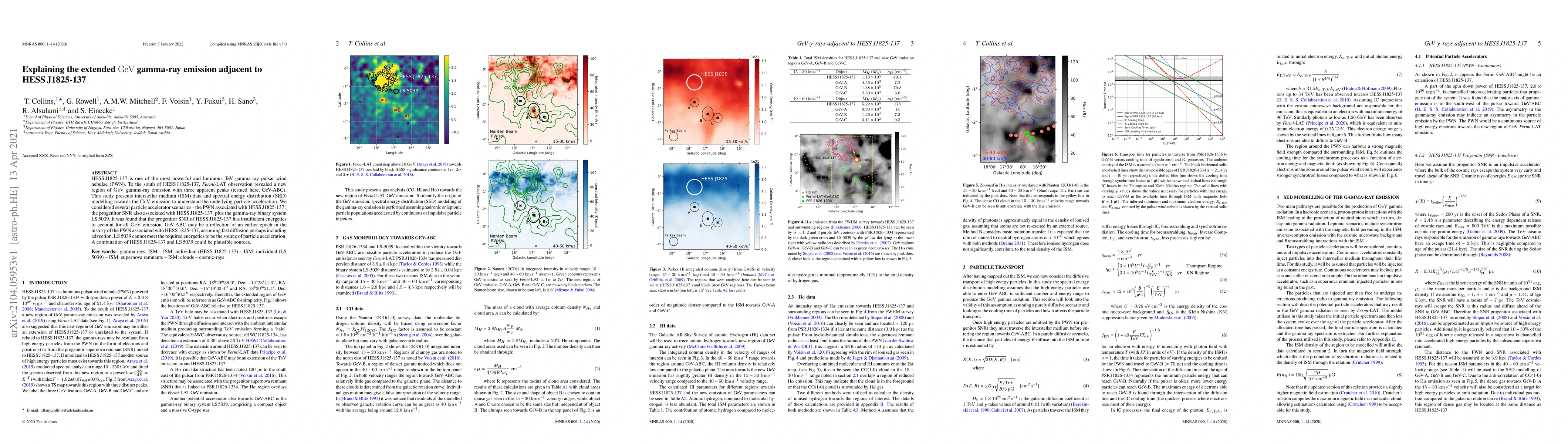 HESS J1825-137 is one of the most powerful and luminous TeV gamma-ray pulsar wind nebulae (PWN). To the south of HESS J1825-137, Fermi-LAT observation revealed a new region of GeV gamma-ray emission with three apparent peaks (termed here, GeV-ABC). This study presents interstellar medium (ISM) data and spectral energy distribution (SED) modelling towards the GeV emission to understand the underlying particle acceleration. We considered several particle accelerator scenarios - the PWN associated with HESS J1825-137, the progenitor SNR also associated with HESS J1825-137, plus the gamma-ray binary system LS\,5039. It was found that the progenitor SNR of HESS J1825-137 has insufficient energetics to account for all GeV emission. GeV-ABC may be a reflection of an earlier epoch in the history of the PWN associated with HESS\,1825-137, assuming fast diffusion perhaps including advection. LS\,5039 cannot meet the required energetics to be the source of particle acceleration. A combination of HESS J1825-137 and LS 5039 could be plausible sources.