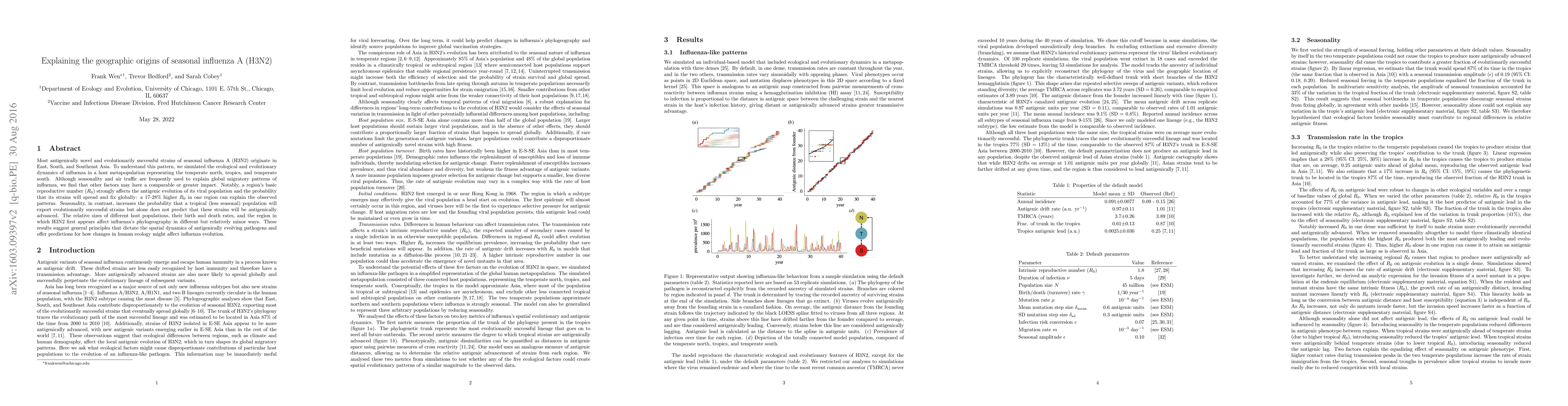Most antigenically novel and evolutionarily successful strains of seasonal influenza A (H3N2) originate in East, South, and Southeast Asia. To understand this pattern, we simulated the ecological and evolutionary dynamics of influenza in a host metapopulation representing the temperate north, tropics, and temperate south. Although seasonality and air traffic are frequently used to explain global migratory patterns of influenza, we find that other factors may have a comparable or greater impact. Notably, a region's basic reproductive number ($R_0$) strongly affects the antigenic evolution of its viral population and the probability that its strains will spread and fix globally: a 17-28% higher $R_0$ in one region can explain the observed patterns. Seasonality, in contrast, increases the probability that a tropical (less seasonal) population will export evolutionarily successful strains but alone does not predict that these strains will be antigenically advanced. The relative sizes of different host populations, their birth and death rates, and the region in which H3N2 first appears affect influenza's phylogeography in different but relatively minor ways. These results suggest general principles that dictate the spatial dynamics of antigenically evolving pathogens and offer predictions for how changes in human ecology might affect influenza evolution.