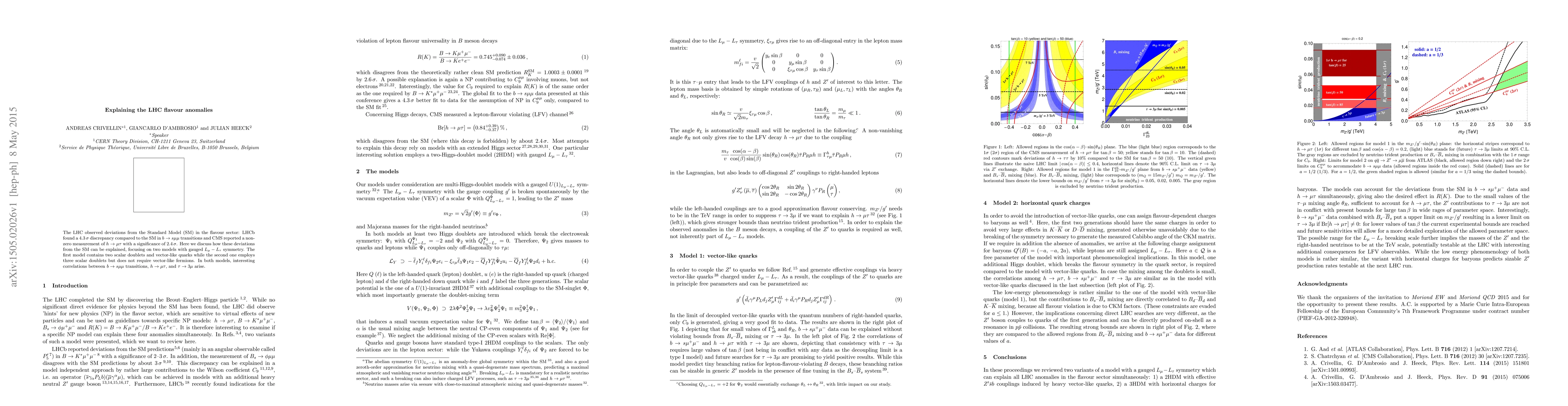 The LHC observed deviations from the Standard Model (SM) in the flavour sector: LHCb found a $4.3\,\sigma$ discrepancy compared to the SM in $b\to s\mu\mu$ transitions and CMS reported a non-zero measurement of $h\to\mu\tau$ with a significance of $2.4\,\sigma$. Here we discuss how these deviations from the SM can be explained, focusing on two models with gauged $L_\mu-L_\tau$ symmetry. The first model contains two scalar doublets and vector-like quarks while the second one employs three scalar doublets but does not require vector-like fermions. In both models, interesting correlations between $b\to s\mu\mu$ transitions, $h\to\mu\tau$, and $\tau\to3\mu$ arise.